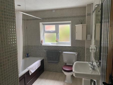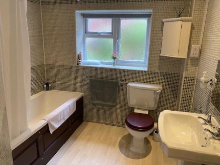 FAMILY BATHROOM A fully tiled room with rear-aspect double-glazed window with obscured glass. Suite with: panelled bath with Victorian-style mixer taps and handheld shower spray; pedestal wash hand basin with illuminated mirror over; and close-coupled WC. There is a contemporary chrome-finished vertical radiator, and a shaver point.