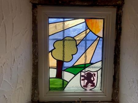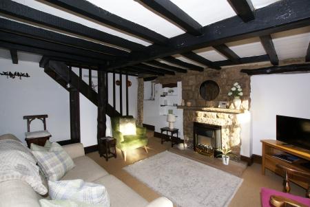 SITTING ROOM With a front-aspect UPVC double-glazed sliding sash window, and a further side-aspect stained glass window, depicting a country scene and a stylised lion. The room has exposed stone work, original beams to the ceiling with a heavy central beam, and a feature fireplace with a raised stone hearth housing a flame-effect electric fire. A staircase rises to the upper floor accommodation. There is an illuminated display niche, central heating radiator with thermostatic valve, and a batten door with thumb-latch leading to: