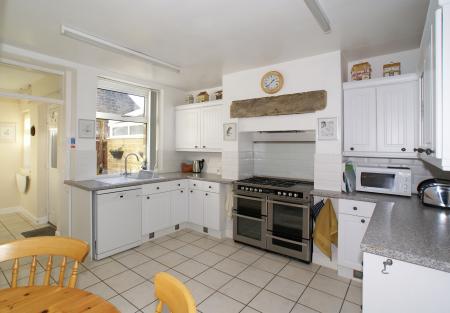 DINING KITCHEN With a rear-aspect double-glazed window overlooking the enclosed rear yard and with views to the wooded hills that surround the area. The room has ceramic tiles to the floor, and a good range of units with cupboards and drawers beneath a roll-edged worksurface with a tile splashback. There are wall-mounted storage cupboards with under-cabinet lighting, and a glass-fronted display cabinet. Set within the worksurface is a sink unit with mixer tap. Set within the chimney piece is a Leisure range-style cooker with a five-burner hob, a ceramic hot plate, and a double oven and grill. Beneath the worksurface there is a Miele 12-place-setting dishwasher. The room has a central heating radiator with thermostatic valve, and ample space for a dining table. A door opening leads to: