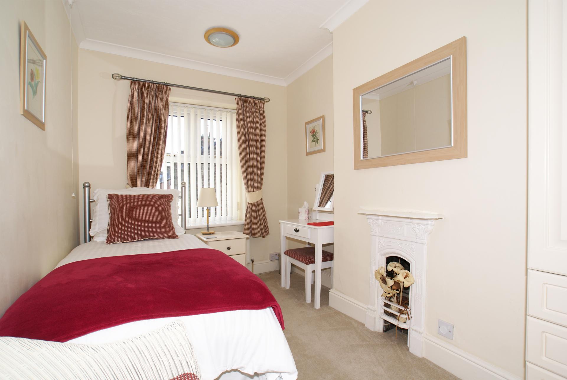 BEDROOM TWO Having rear-aspect UPVC double-glazed windows with far-reaching views to the wooded hills that surround the area. The room has a central heating radiator, and a feature cast iron bedroom fireplace.