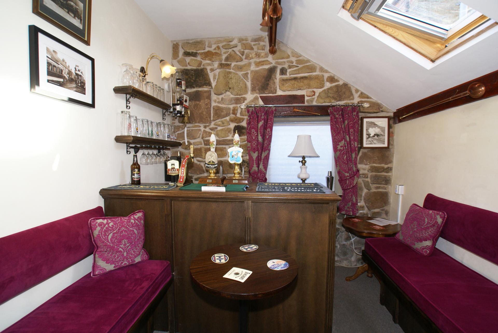 STONE OUT BUILDING WITH BAR Having a rear-aspect window and Velux rooflight. The space is fitted out as country pub with fitted bench seating, and bar with pumps, cooler unit, wine fridge, and sink.