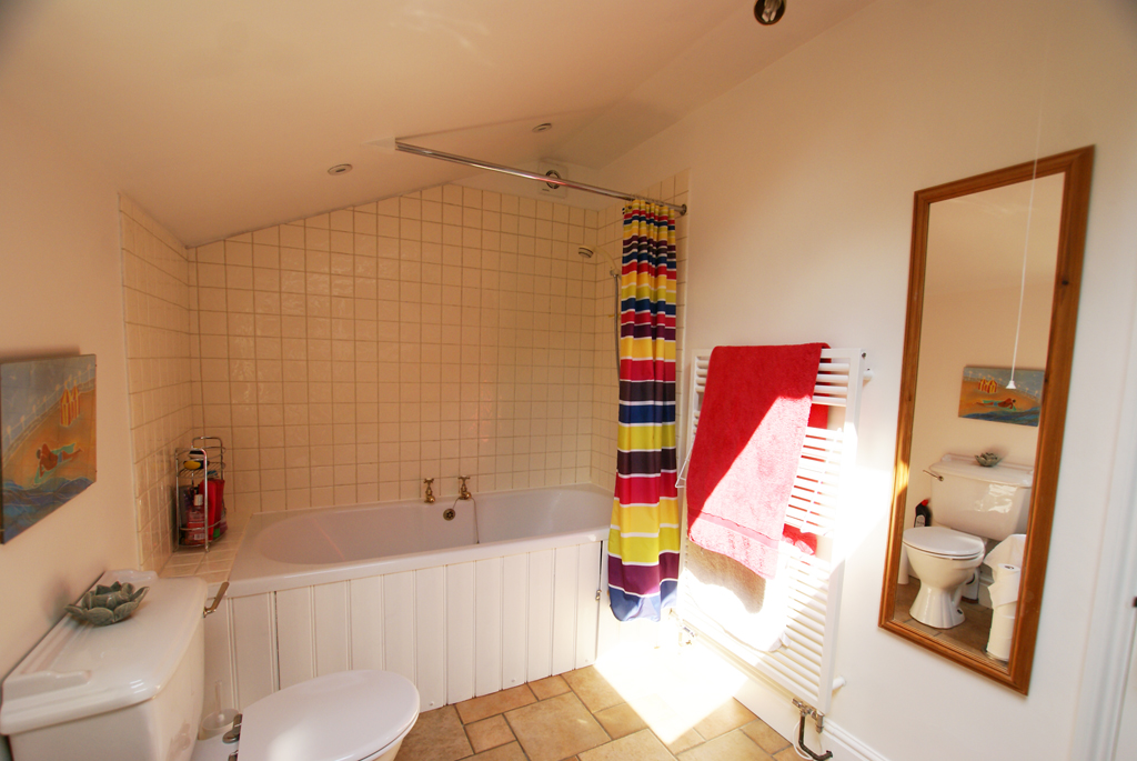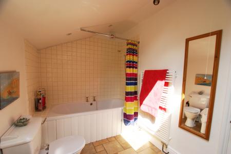 Family Bathroom 10'3" X 6'6" A spacious bathroom with double-glazed Velux window and double-glazed side aspect window with obscured glass. There is a large double-ended bath with an electric shower over, close-coupled WC and pedestal wash hand basin, built-in wooden shelving and a storage cupboard housing a 5-year-old Baxi Combi Boiler with remote thermostat control. The bathroom is lit by a 3-light LED spotlight bar and recessed LED spot lighting over the bath and is ventilated by an extractor fan. It has a ceramic tiled floor and wall tiles behind the hand basin and bath. There is a central-heating towel rail which is fitted with an electric element for drying towels, useful in warmer weather when the central heating is not in use.