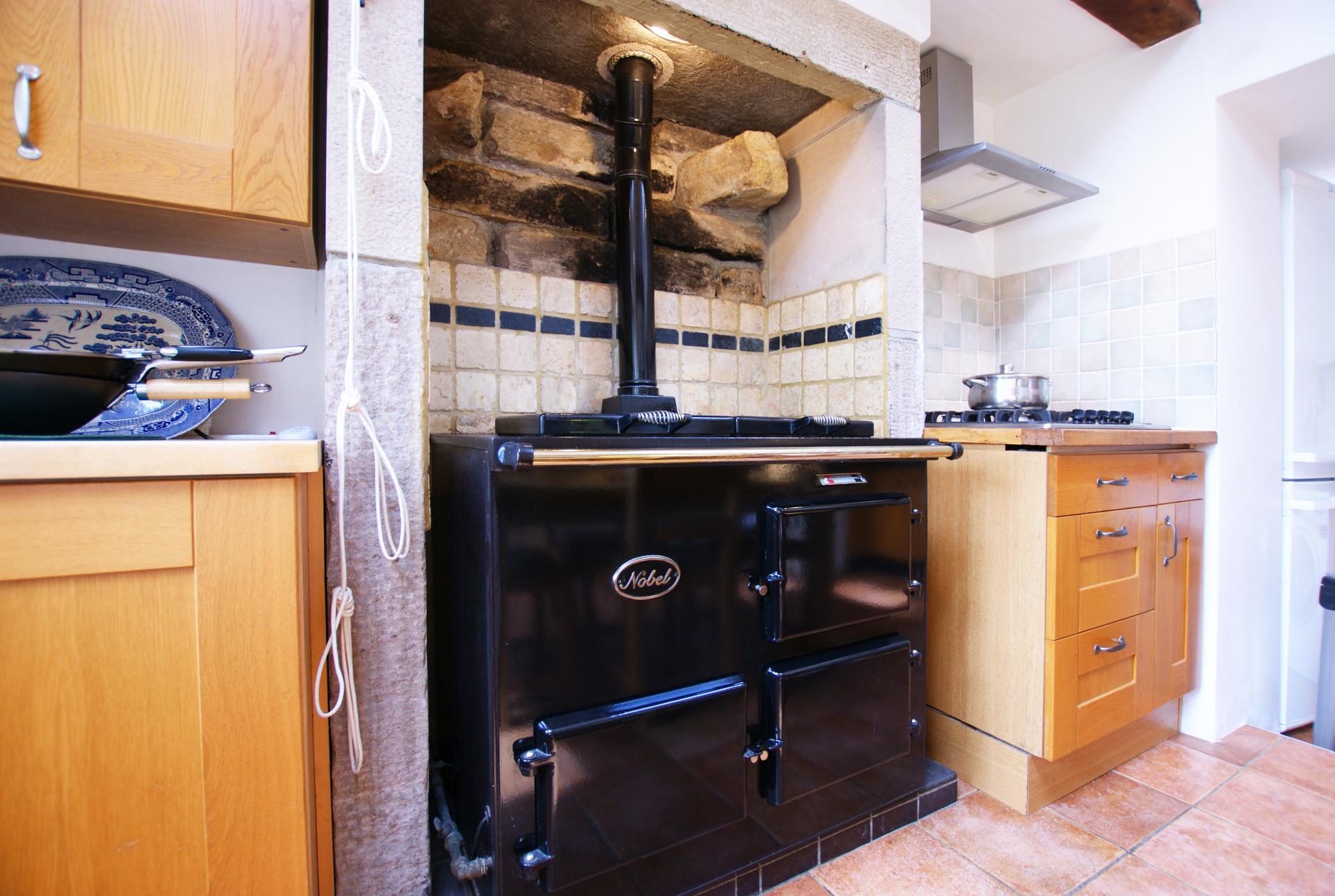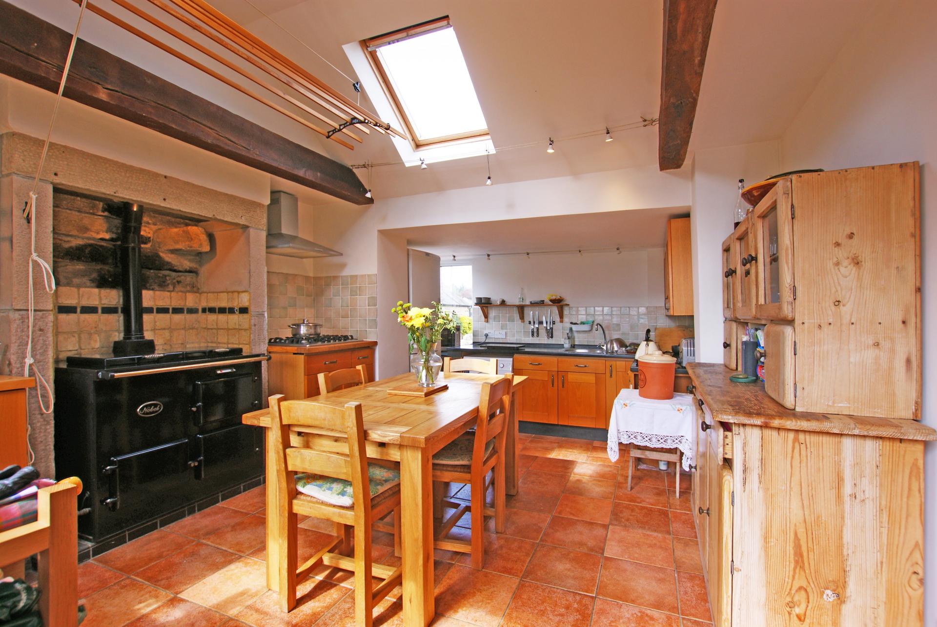A single-story split-level Kitchen/Diner 17'3" x 12'6" This is a lovely light room with wooded views of Oaker Hill, ceramic floor tiles, chapel ceiling and 2 Velux windows with a solid oak double-opening casement window to the front and a sealed corner window; all double-glazed, with modern LED downlights. It is furnished with a good range of kitchen cupboards and drawers in a light rustic light oak finish, either wall-mounted or set beneath black-stained beechwood surfaces with tiled splashback and light natural beech work surfaces in the dining area. There is also a new electric oven and separate 5-ring gas hob, a