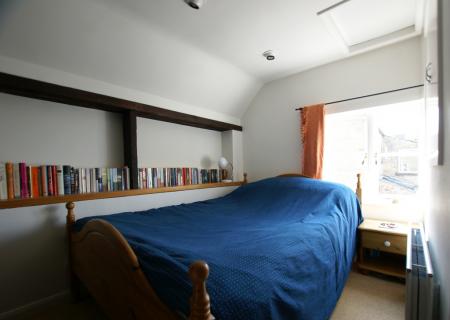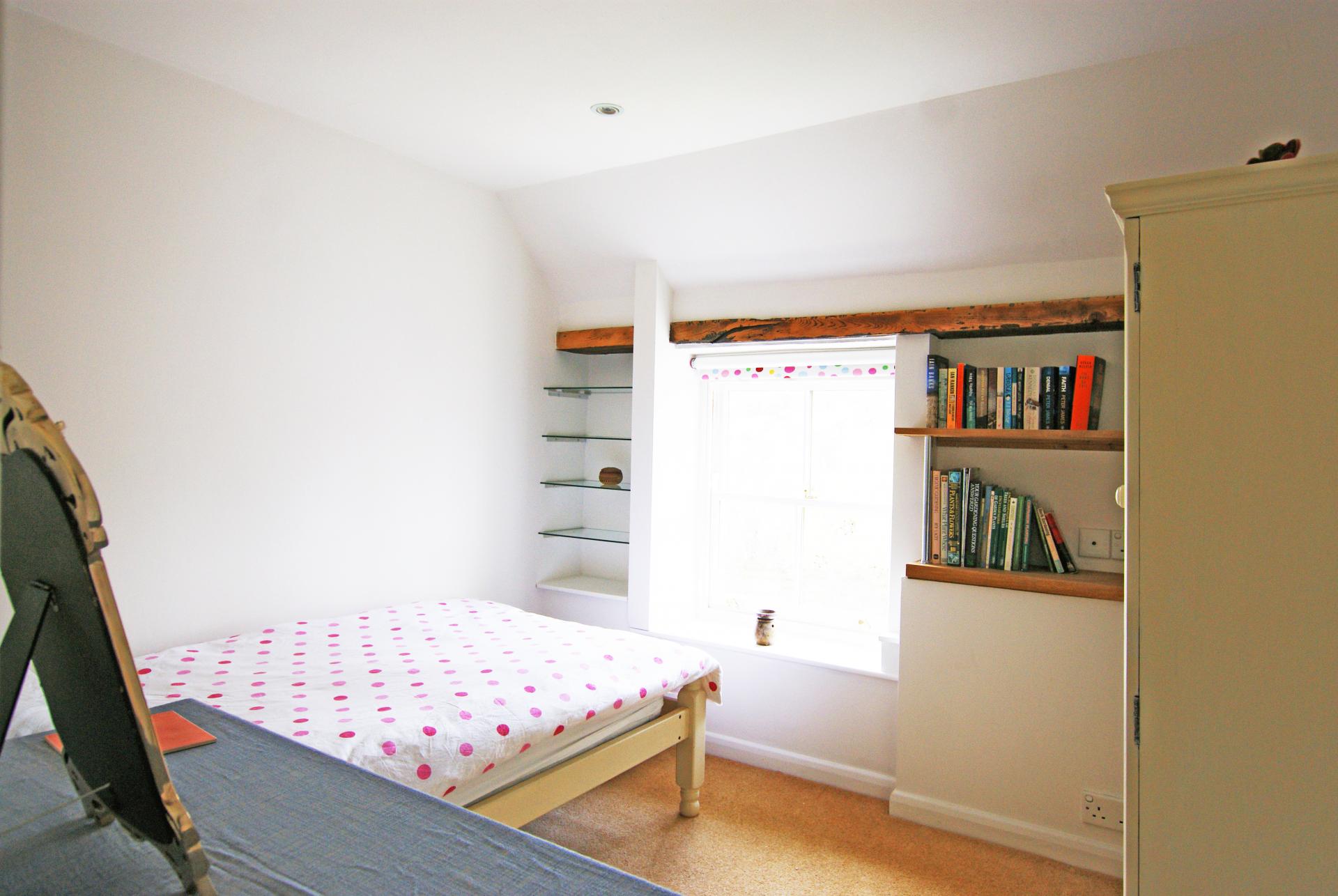 Single Bedroom Three 9'1" X 8'11" This lovely room has in-built oak and glass shelving, a front aspect double-glazed sash window overlooking the front garden with beautiful, wooded views of Oaker Hill, C/H radiator with TRV and recessed dimmable LED spotlights, including an independently controlled overhead reading light.