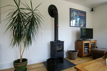 Through Lounge 24'5" x 11'8" A very light spacious room with double-glazed windows - 2 front-aspect sash windows and large gable end sash window, and double-glazed anthracite grey UPVC french windows opening onto the good-sized rear garden, altogether offering far-reaching wooded views of Oaker Hill, the hills surrounding Matlock, Darley hillside, Two Dales, and Stanton Moor. The room has light oak Amtico flooring and a Chamwood Cove 1 multi-fuel stove, TV Aerial points and Sky facility, 2 C/H radiators with TRVs, recessed LED spotlights and a light switch for the back garden lighting. A glass panelled door leads to: