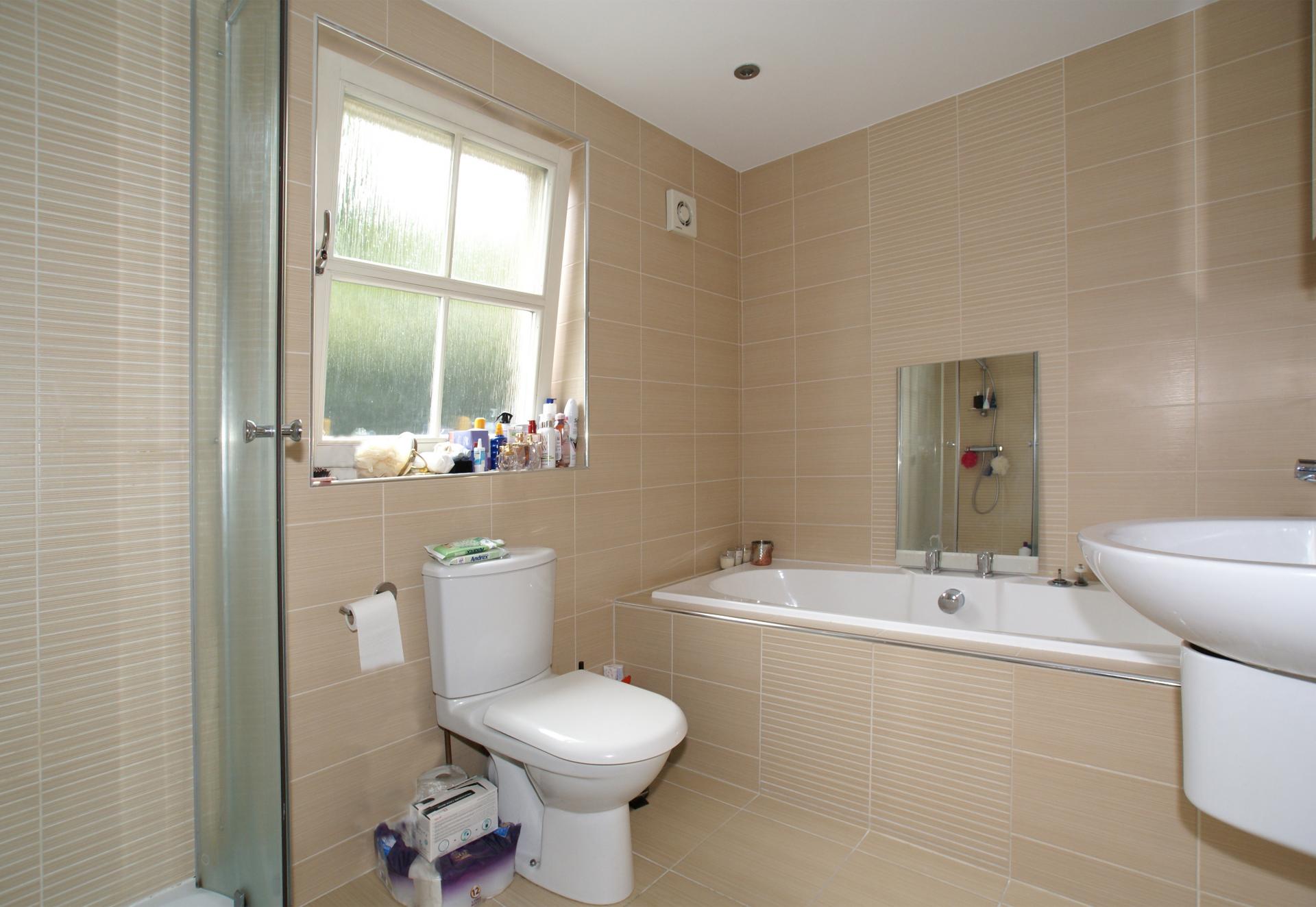 Family Bathroom A fully tiled contemporary bathroom with ceramic tiled floor having a rear aspect window with obscured glass. Suite with inset double ended bath, contemporary wall hung wash hand basin with pillar tap, dual flush close coupled W.C and quadrant shower cubicle with mixer shower. There is a chrome finished ladder style towel radiator, halogen down light spotlights and an extractor fan.
