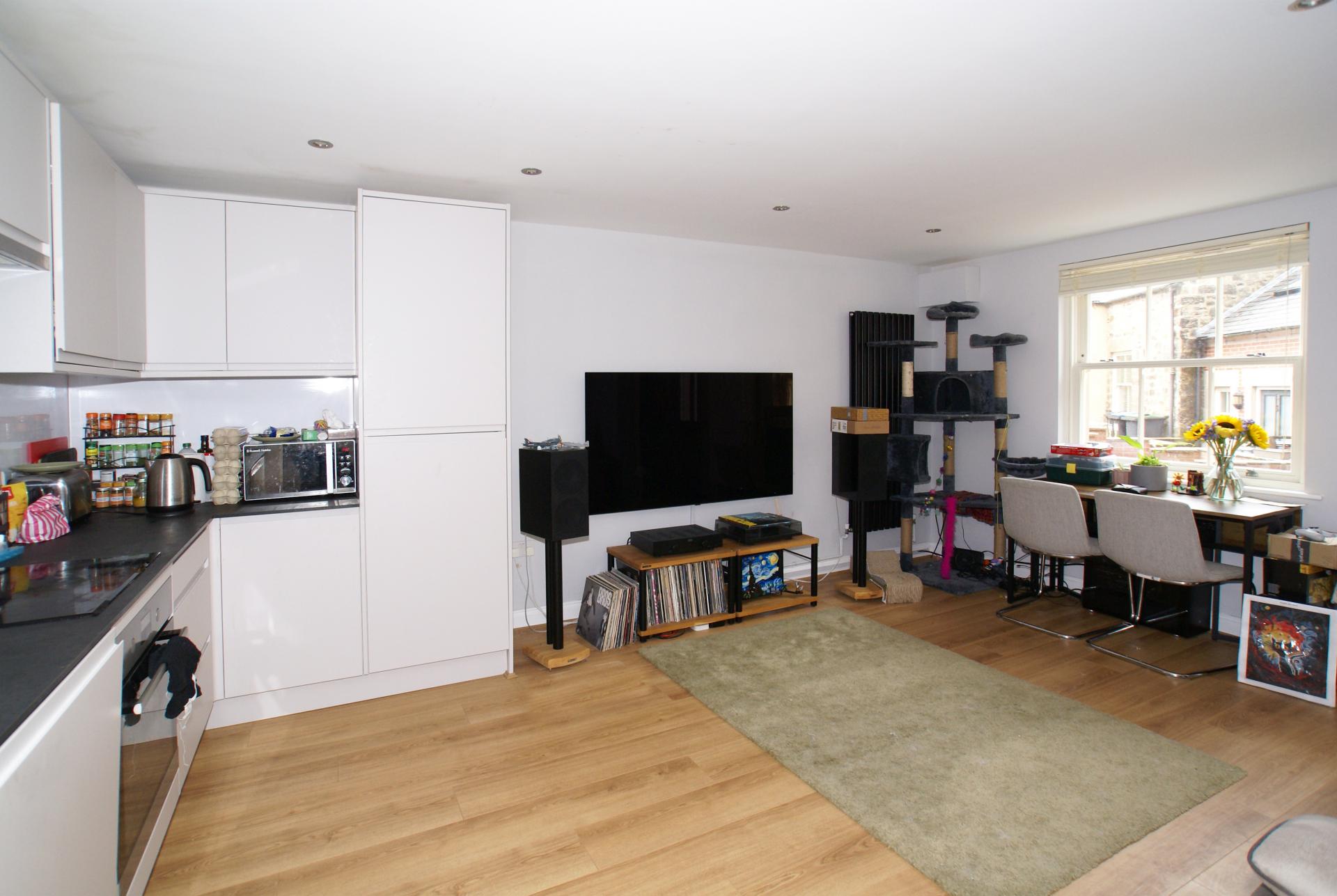 With a front aspect double glazed sliding sash window overlooking the patio and courtyard. The room has a central heating radiator, television aerial point with satellite facility and telephone point. The kitchen area of the room has a recently fitted range of contemporary units with cupboards and drawers beneath a quartz works surface with a tiled splashback and wall mounted storage cupboards. Set within the work surface is an undermounted stainless sink with mixer tap and a 4-ring ceramic hob over which is an extractor canopy. Beneath the hob is an electric fan assisted oven and grill. Integral appliances include fridge, freezer and dishwasher. A door opens to a utility cupboard which houses the gas fired combination boiler which provides hot water and central heating to the property. There is a space for an automatic washing machine within the cupboard. A further door opens to: