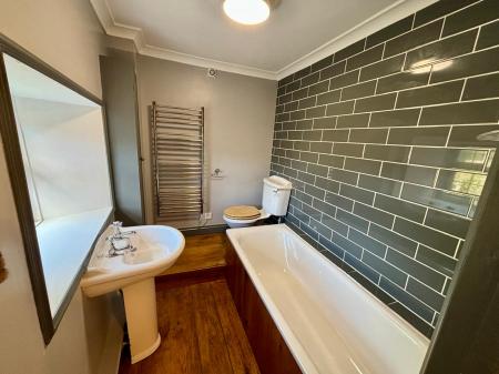 The BATHROOM is fitted with a white panelled bath with chrome taps and metro style grey tiled splash backs and wall mounted stainless steel electric shower over. There is a pedestal wash hand basin with chrome taps, a low level WC and a chrome effect wall mounted electric towel rail. There is a UPVC double glazed window to the rear elevation.