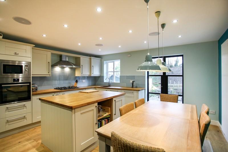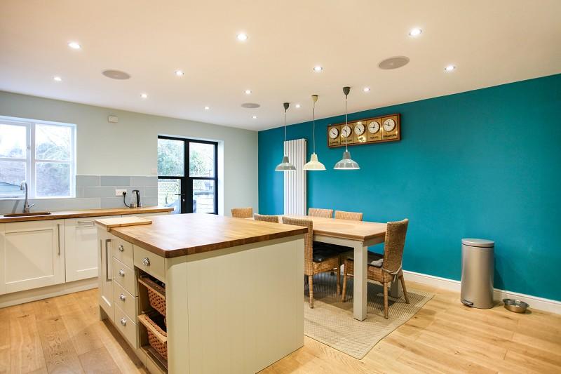 With light oak engineered flooring, oak parquet central podium with three base cupboards, vegetable rack and four drawer unit. Matching work tops fitted to two sides with five ring AEG gas hob with double width externally ducted cooker hood above. Tiled surround to work surfaces, integrated moulded stainless steel sink, integrated Zanussi dishwasher. Pull-out unit, two integrated cutlery trays, two 2 tier pan drawers, two integrated spice racks and three further base cupboards. Four matching wall-mounted cupboards, one housing Ideal boiler. Large vertical column radiator. Double doors opening on to rear garden, ample space for large dining table. American-style Maytag freestanding fridge-freezer plugged in with ice and water feed. Four integrated ceiling speakers controlled by an amplifier in one corner compatible with Alexa. Split-level Zanussi microwave with built-in matching electric circatherm oven below.