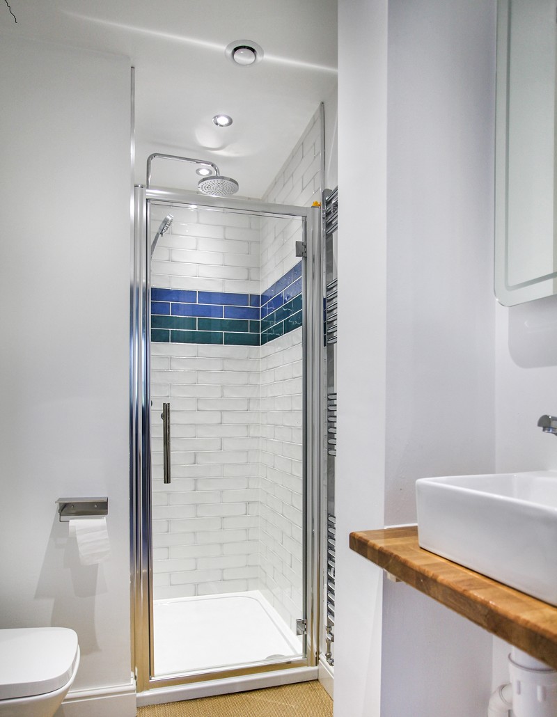 With three piece suite in white, wash hand basin set on to oak shelf, low flush w.c. Walk-in shower with fully tiled cubicle with rain shower head and hand-held shower spray, glazed door. Chrome ladder-style heated towel rail and radiator. Wall-mounted illuminated shaving mirror.