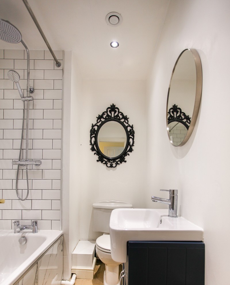 With three piece suite in white, wash hand basin set on to double cabinet, low flush w.c. Enamel steel bath with fully tiled surround and rain head shower spray and hand held shower spray. Single radiator and circular mirror.