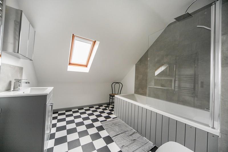 Three piece suite in white with a low flush WC, wall mounted sink with cupboard below and a wall mounted vanity unit above. Ladder style heated towel rail and radiator. Bath with overhead rain style shower and fitted shower screen. Velux window with fitted blind and a lino flooring.