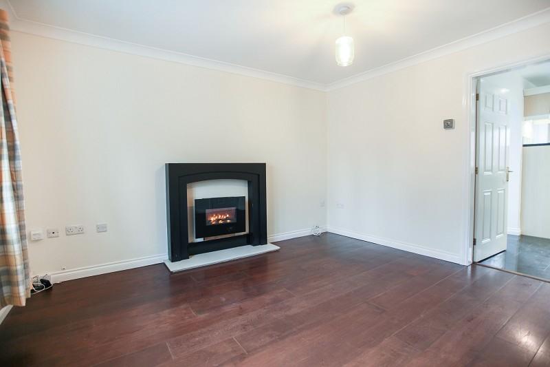 Stained solid oak timber floor with flame effect wall mounted electric fire with composite marble back and hearth and moulded timber surround, double radiator, TV aerial point, telephone point and walk in understairs storage cupboard with light.