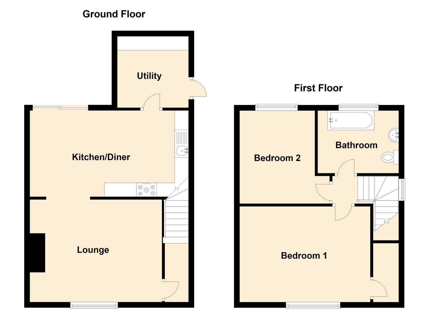 The accommodation briefly comprises: open-plan ground floor layout featuring a lounge flowing into the kitchen-diner, complete with a striking feature fireplace housing a multi-fuel burner and sliding doors opening to the rear, along with a practical utility area also offering rear access. To the first floor, the landing leads to two double bedrooms- the main one benefiting from fitted wardrobes, together with a generously sized three-piece family bathroom WC. The property further boasts double glazing, gas central heating and a partially boarded-out loft.