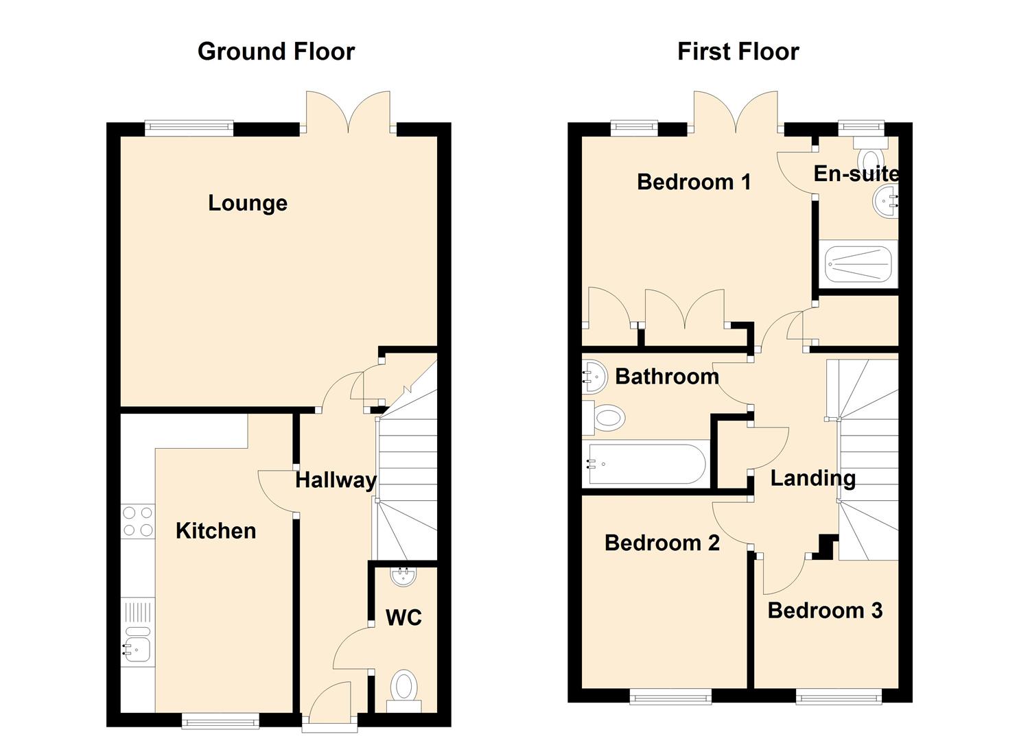 The accommodation briefly comprises to the ground floor: an inviting entrance hallway with a convenient WC and useful understairs storage, a well-appointed kitchen fitted with a range of wall and base units along with an integrated oven and hob, and a bright, airy lounge-diner featuring French doors that open onto the rear garden. Off the landing to the first floor, you can find three bedrooms- two of which are doubles, with the main bedroom enjoying the added luxury of an ensuite shower room and a Juliet balcony. There is also a three-piece family bathroom WC that completes the layout. Externally, the property benefits from a low-maintenance front lawn and an enclosed rear garden, providing an ideal space for relaxation or outdoor entertaining.