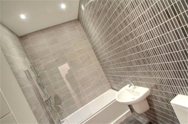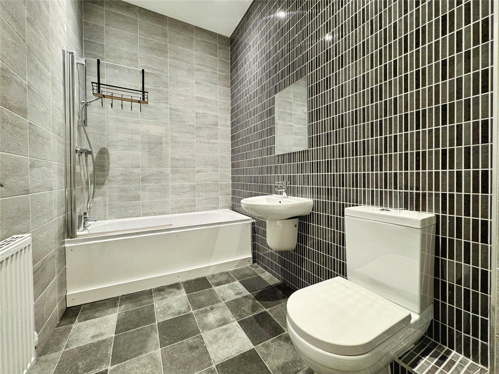 Bath with shower overhead, wash hand basin, WC, radiator.