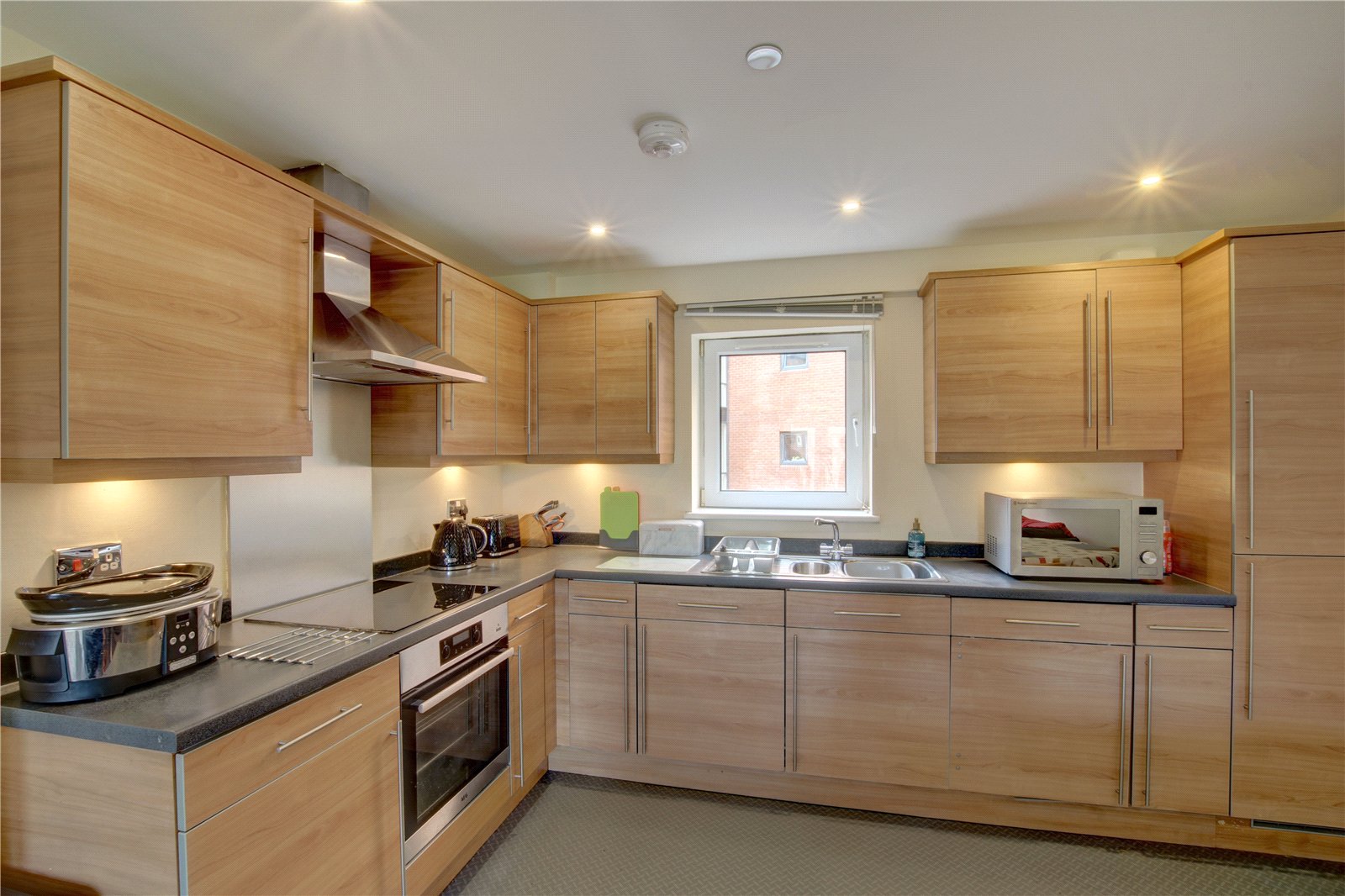 Range of wall and base units with roll edge worktop surfaces incorporating stainless steel one and a half bowl sink unit with mixer tap, splashbacks, integrated electric oven and hob with stainless steel splashback and extractor above, fridge and freezer, dishwasher, washing machine, wall mounted electric heater, double glazed window, ceiling spotlights.