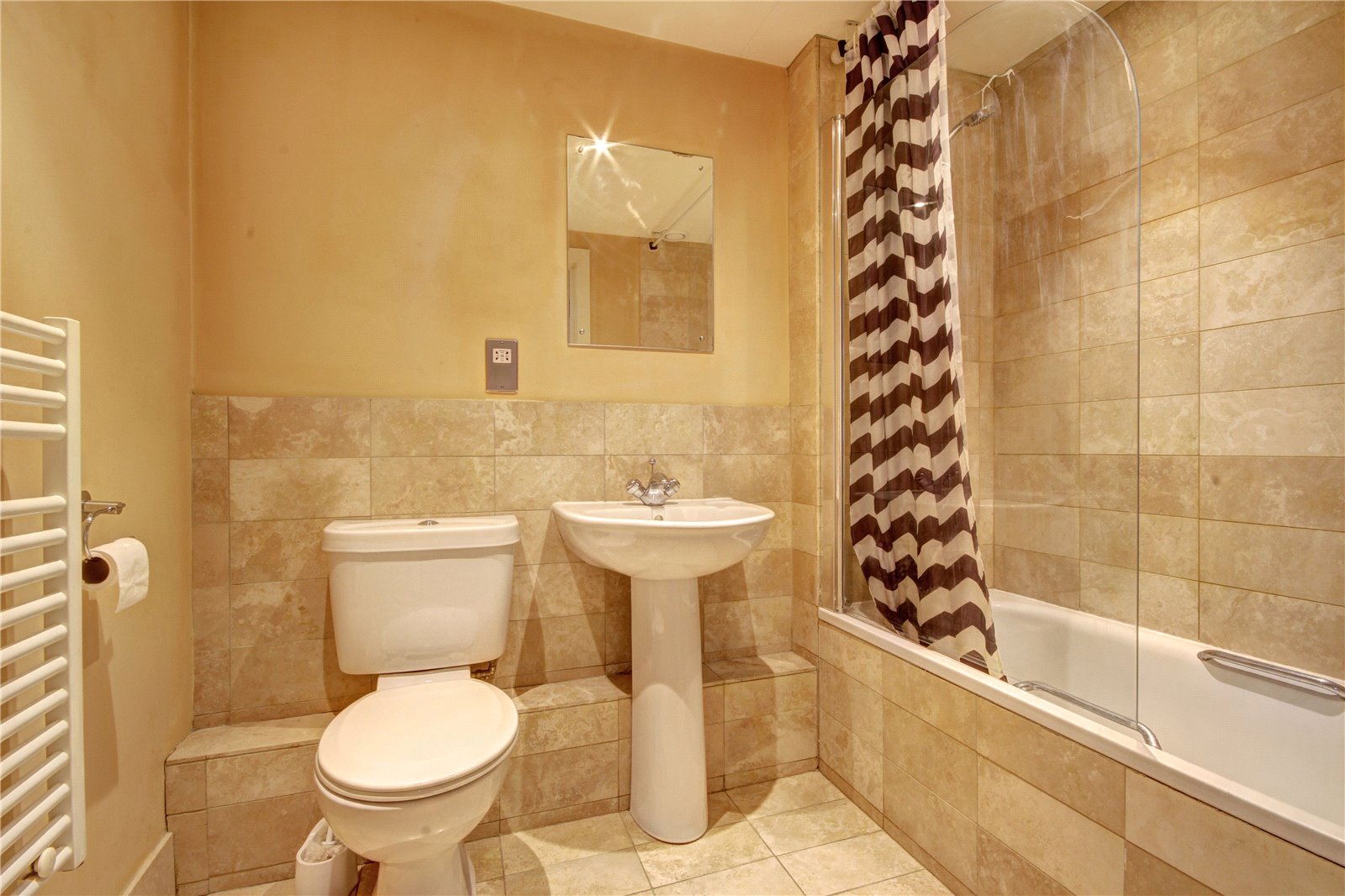 Panelled bath with shower above, WC, wash hand basin, shaving point, heated towel rail, extractor fan.