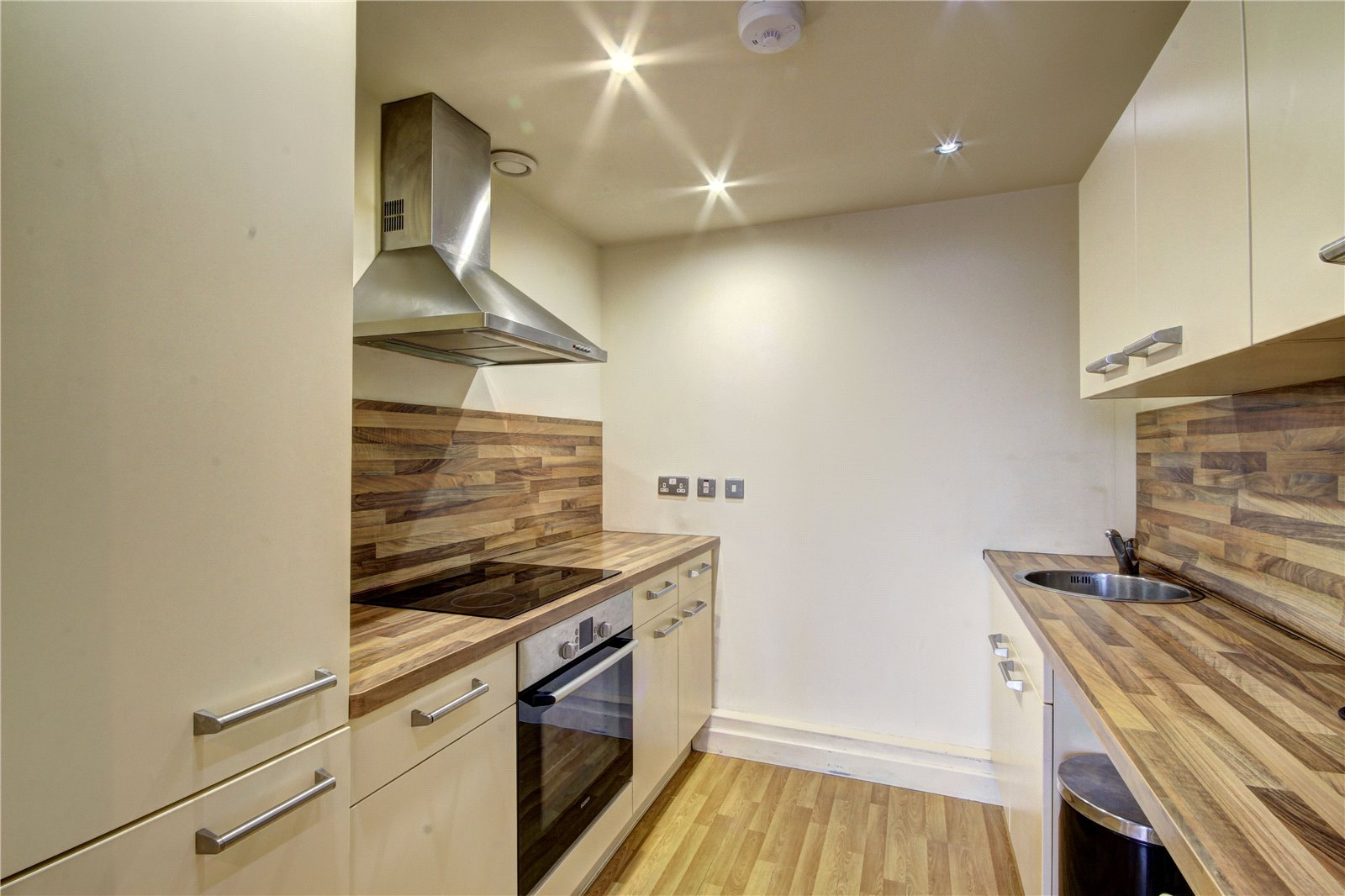 Range of wall and base units with worktop surfaces incorporating; stainless steel sink unit with mixer tap, electric oven and hob with extractor fan above and built in fridge/freezer.