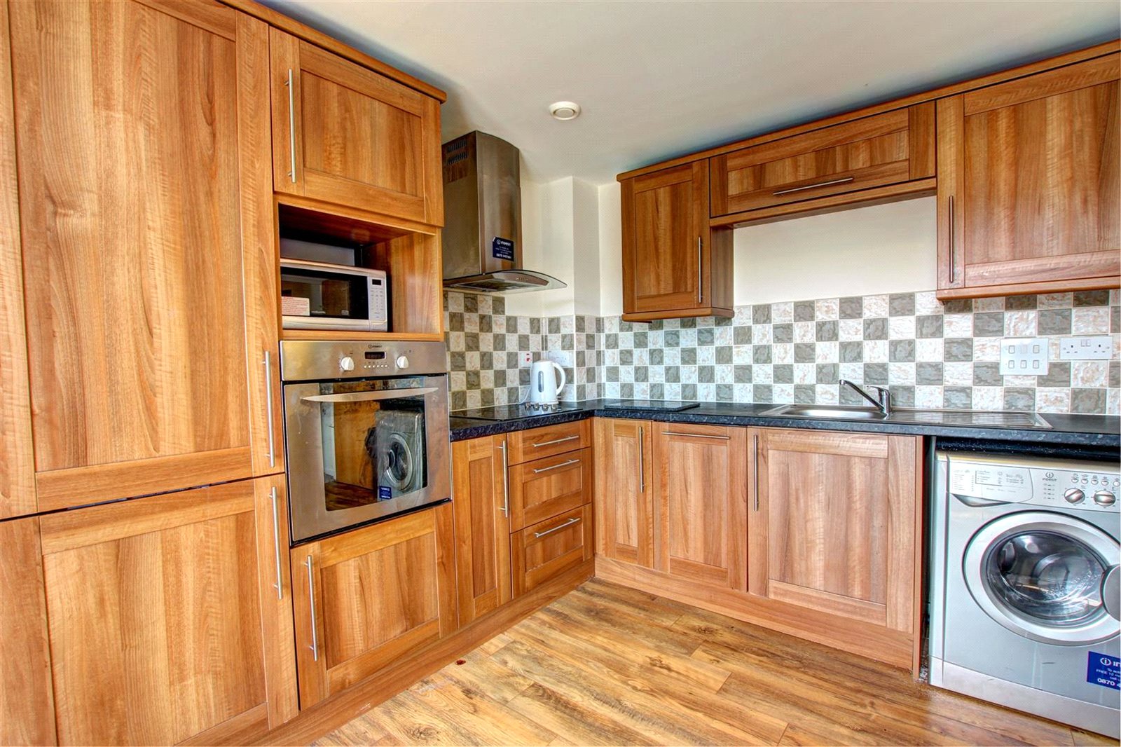 Range of wall and base units with roll edge worktop surfaces incorporating sink unit, splashbacks, integrated electric oven, microwave and hob, washing machine.