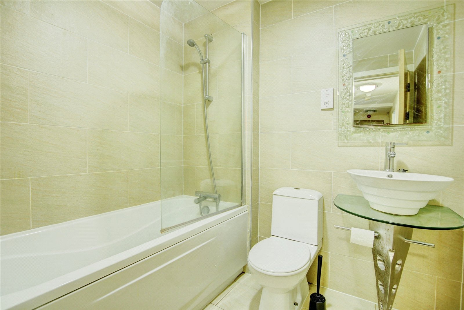 Panel bath with shower above, tiled walls and flooring, towel rail radiator, wash hand basin, WC.