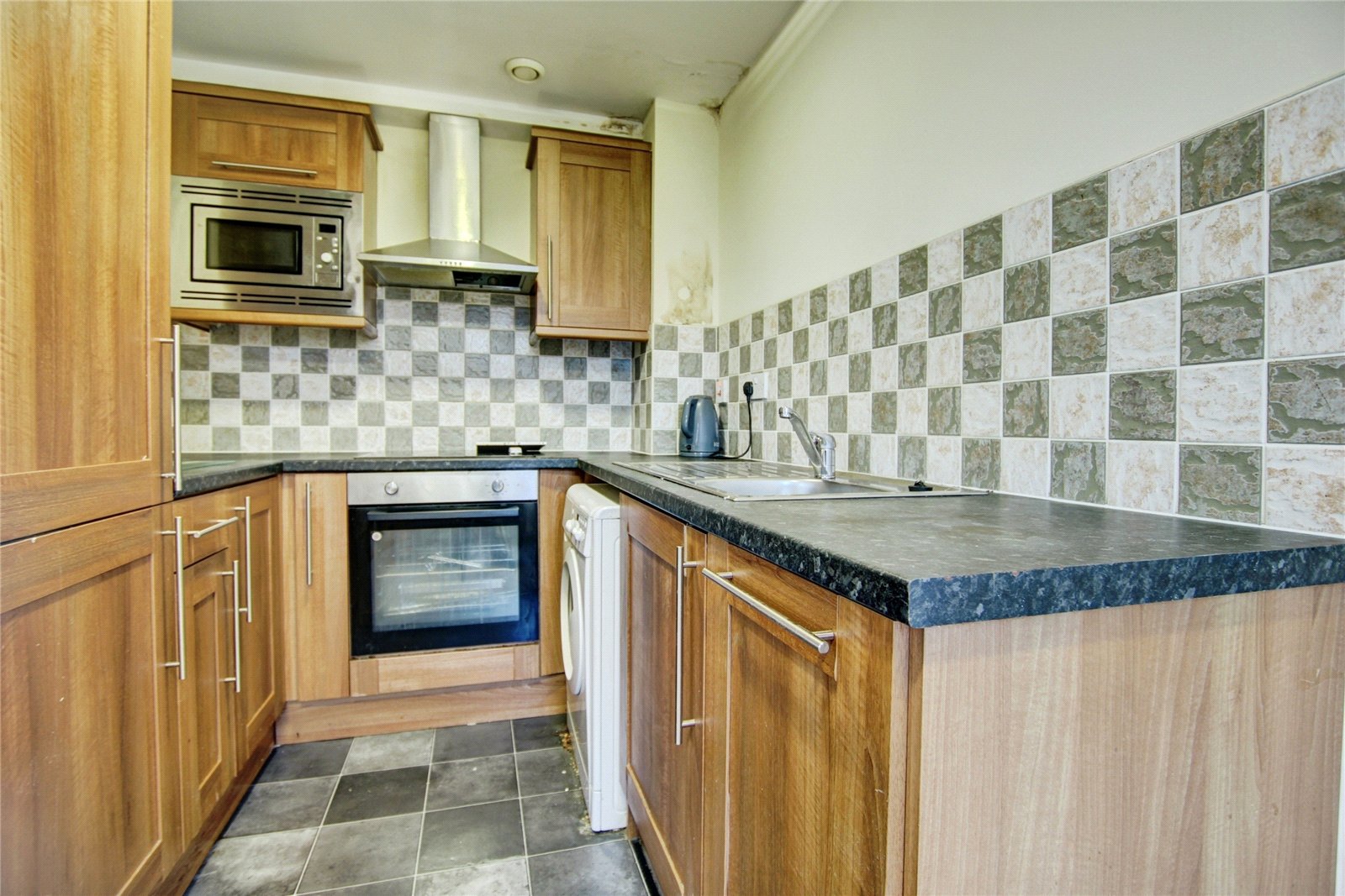 Range of wall and base units with roll edge worktop surfaces incorporating sink unit, splashbacks, integrated electric oven, microwave and hob, washing machine, integrated fridge freezer.
