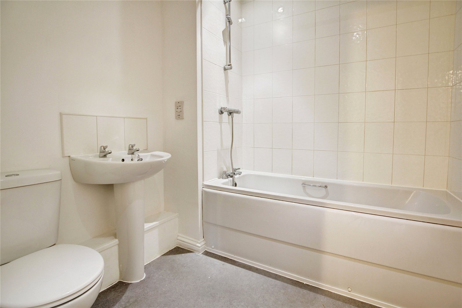 Panel bath with shower above, pedestal wash basin, WC, tiled splashbacks, electric shaver point, ceiling spotlights.