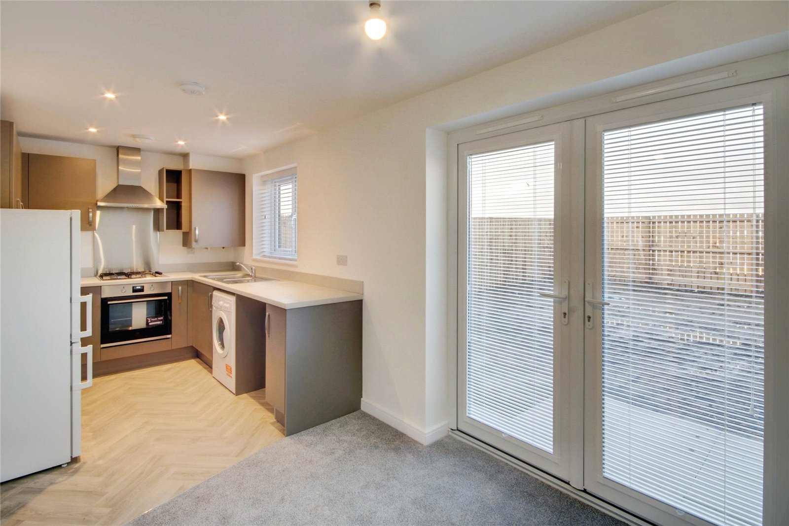 Range of wall and base units with roll edge worktop surfaces incorporating one and a half bowl stainless steel sink unit with mixer tap, splashbacks, integrated electric oven and hob with splashback and extractor above, fridge freezer and washing machine, space for dishwasher, radiator, ceiling spotlights, double glazed window to rear elevation, double glazed French doors to rear garden.