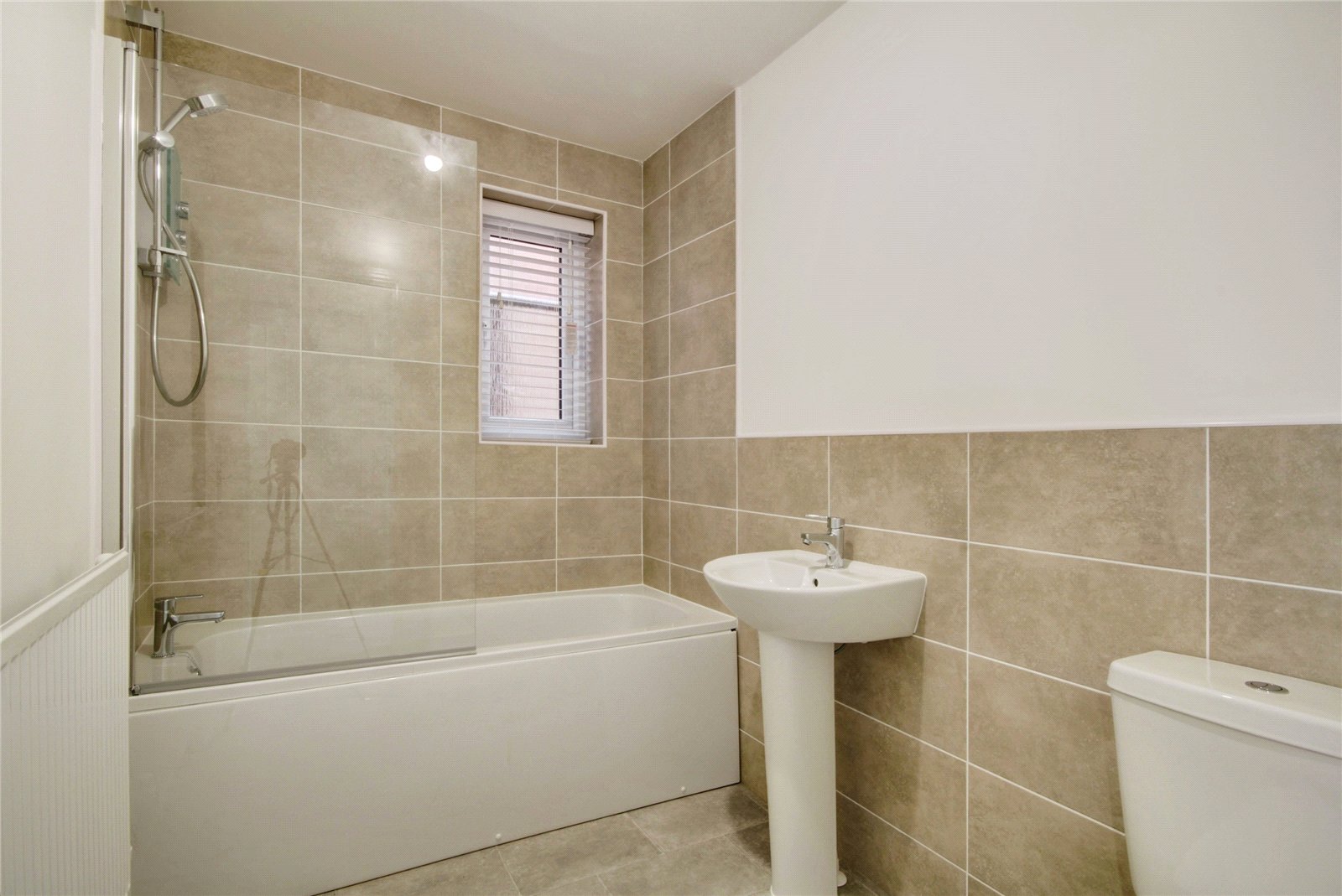 Panel bath with shower above and screen, pedestal wash basin, WC, part tiled walls, double glazed window, radiator.