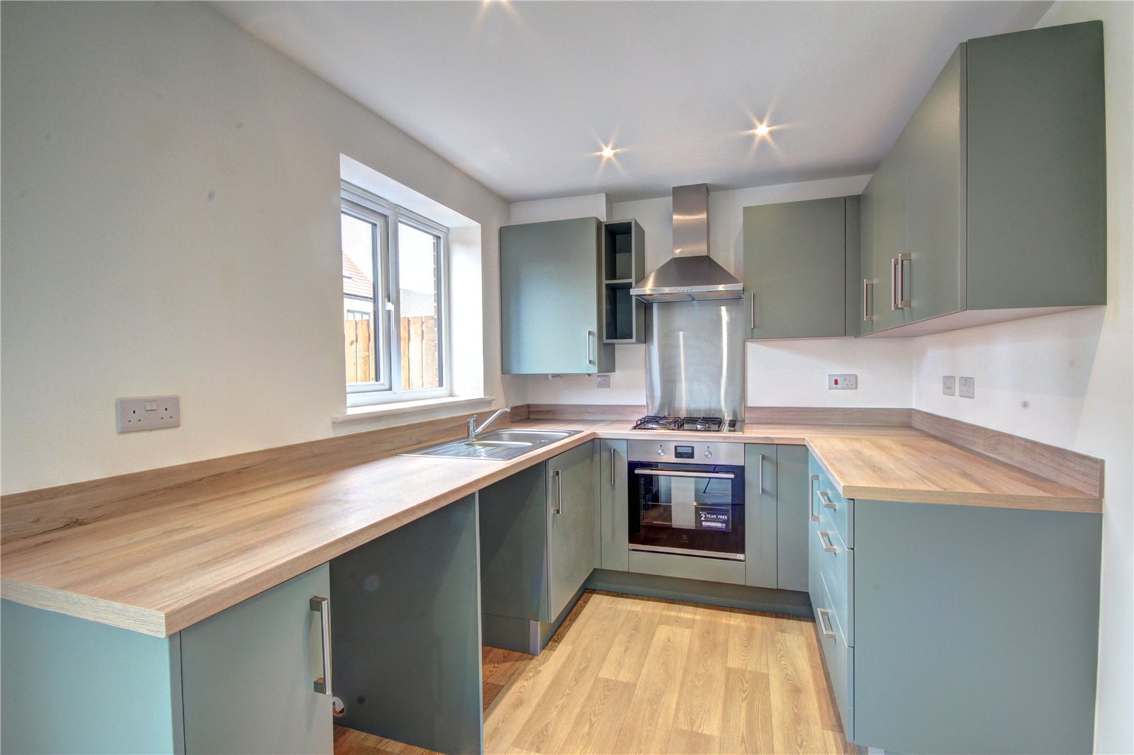 Range of wall and base units with roll edge worktop surfaces incorporating one and a half bowl stainless steel sink unit with mixer tap, splashbacks, integrated electric oven and hob with splashback and extractor above, fridge freezer and washing machine, space for dishwasher, radiator, ceiling spotlights, double glazed window to rear elevation, double glazed French doors to rear garden.