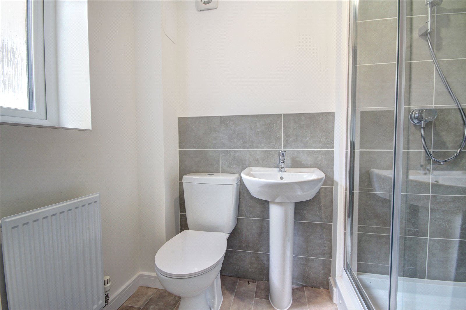 Shower in cubicle, pedestal wash basin, WC, part tiled walls, extractor, double glazed window.