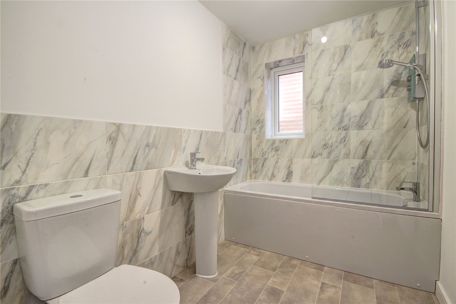 Panel bath with shower above and screen, pedestal wash basin, WC, part tiled walls, double glazed window, radiator.