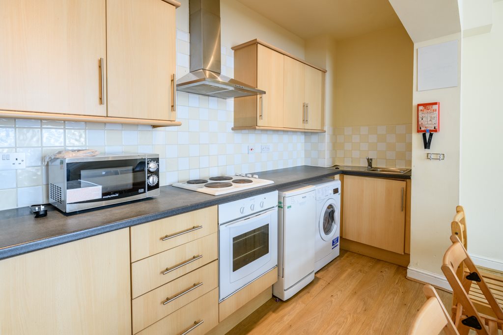Fitted wall and floor units, electric hob, oven, extractor over, washing machine, dish washer, sink and fridge freezer.