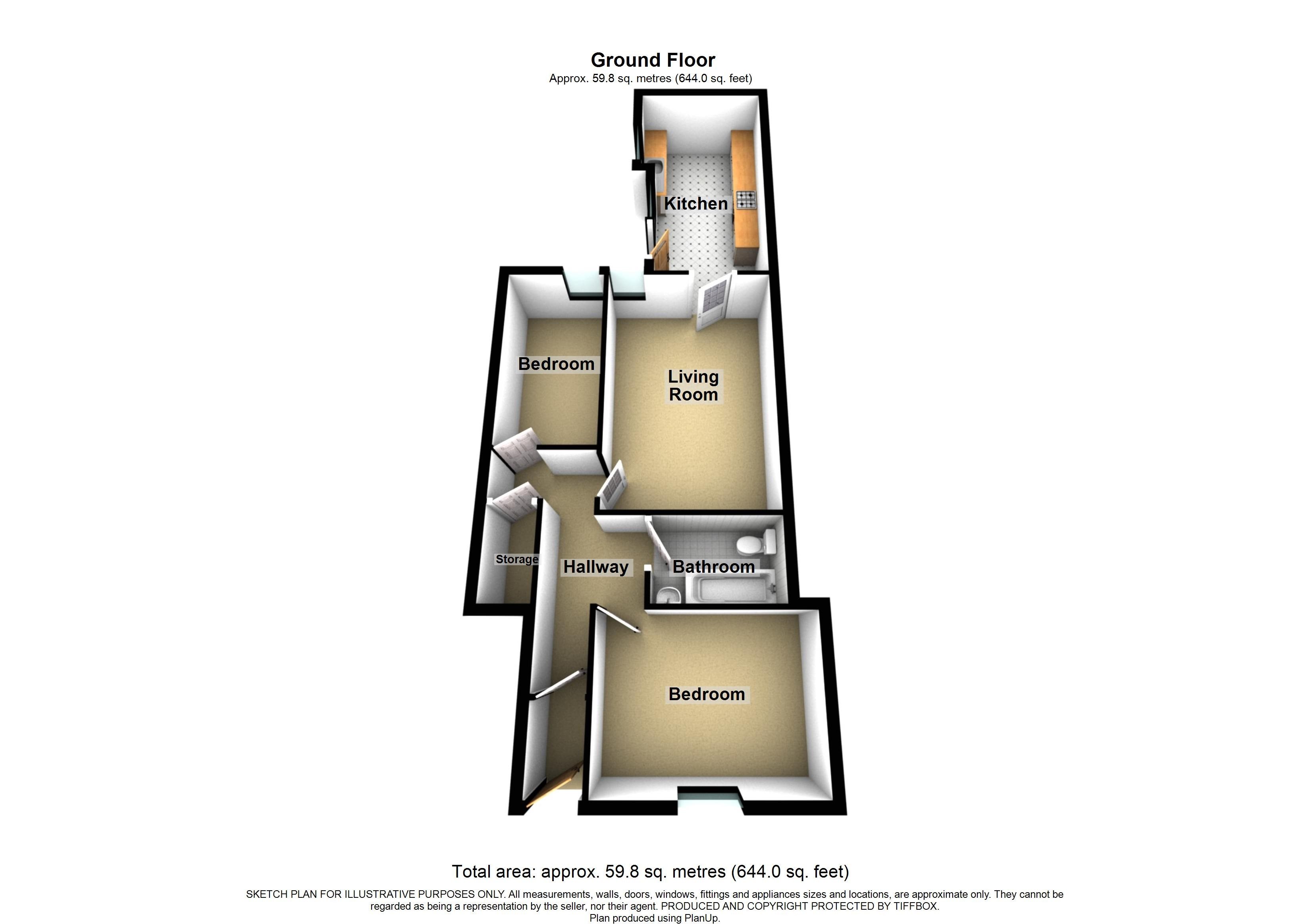 The property comprises entrance, lobby, hallway, living room, kitchen, two bedrooms and a bathroom with white suite.