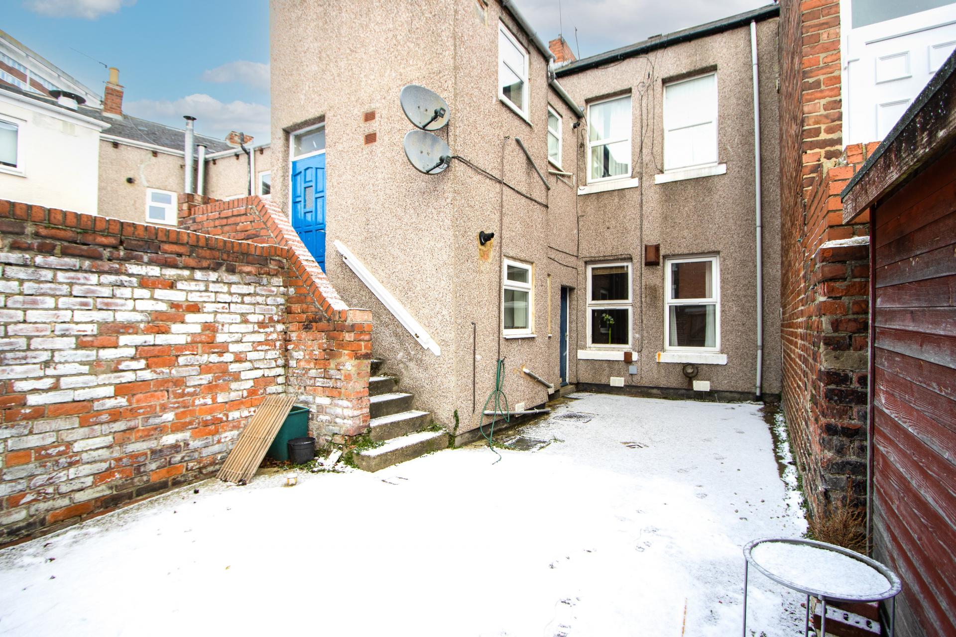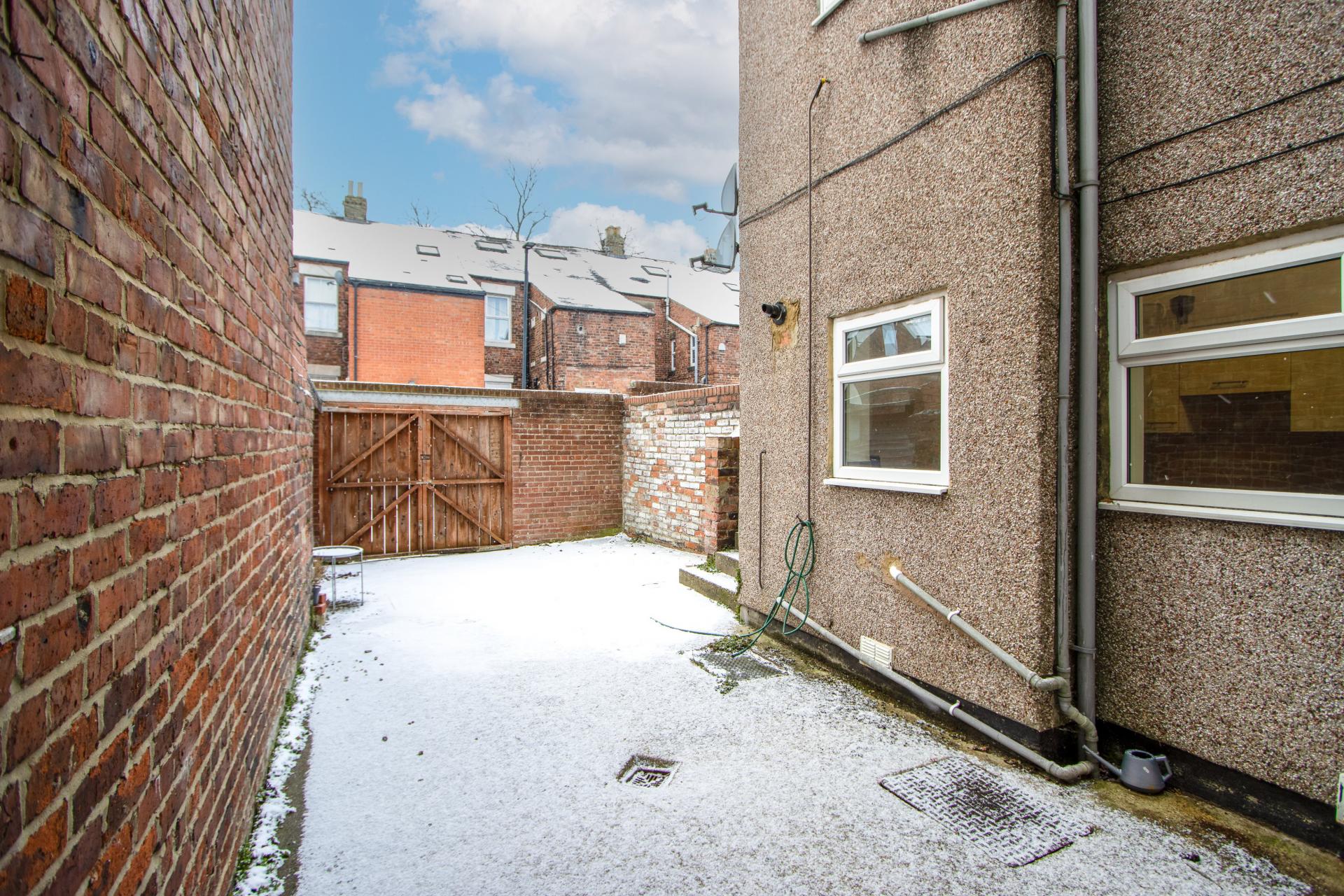 Concrete yard to the rear with double gates to the back lane allowing car access for off street parking.