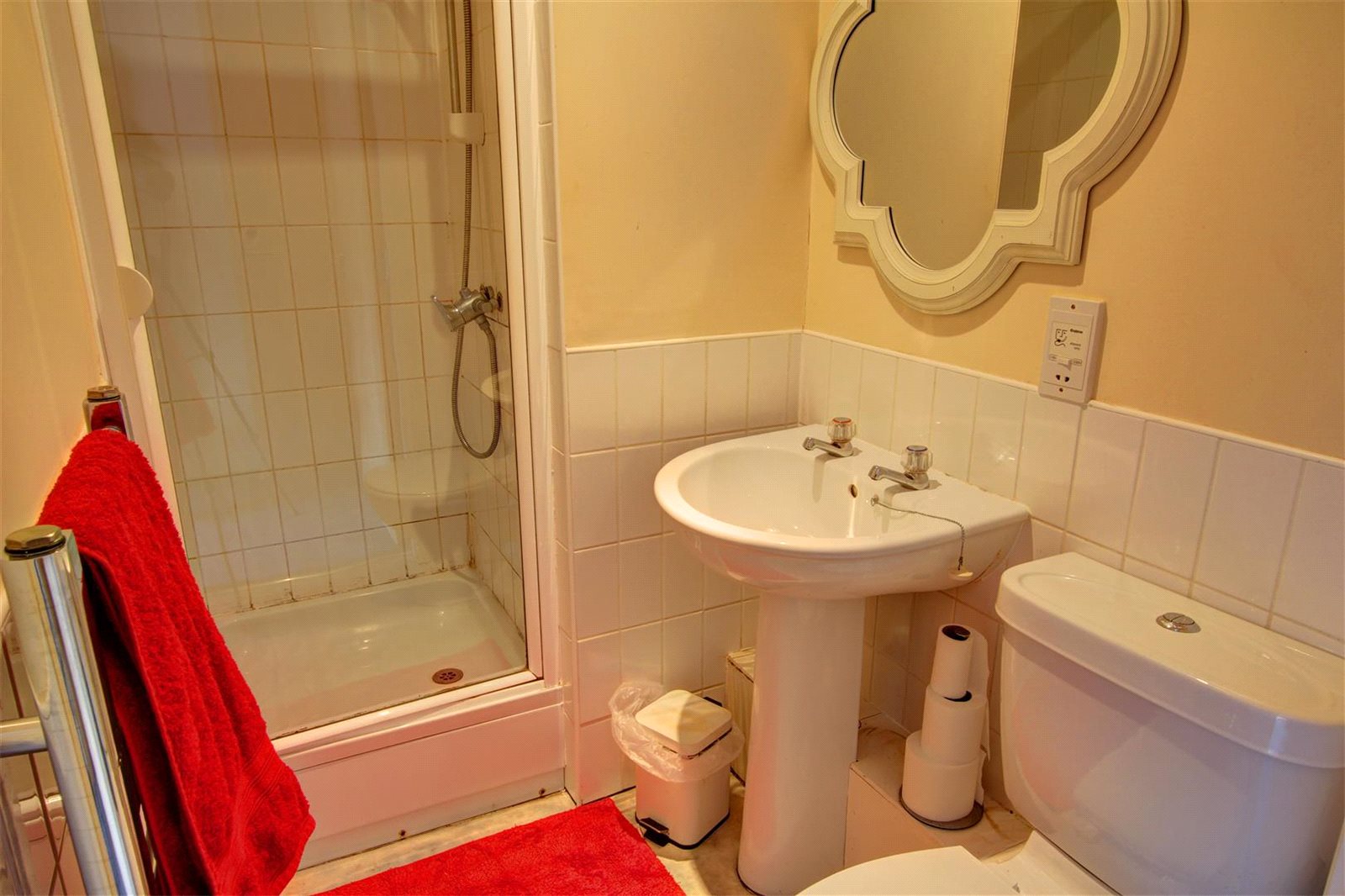 Wash hand basin, WC, shower cubicle, part tiled walls, heated towel rail and electric shaver point, spot lighting.