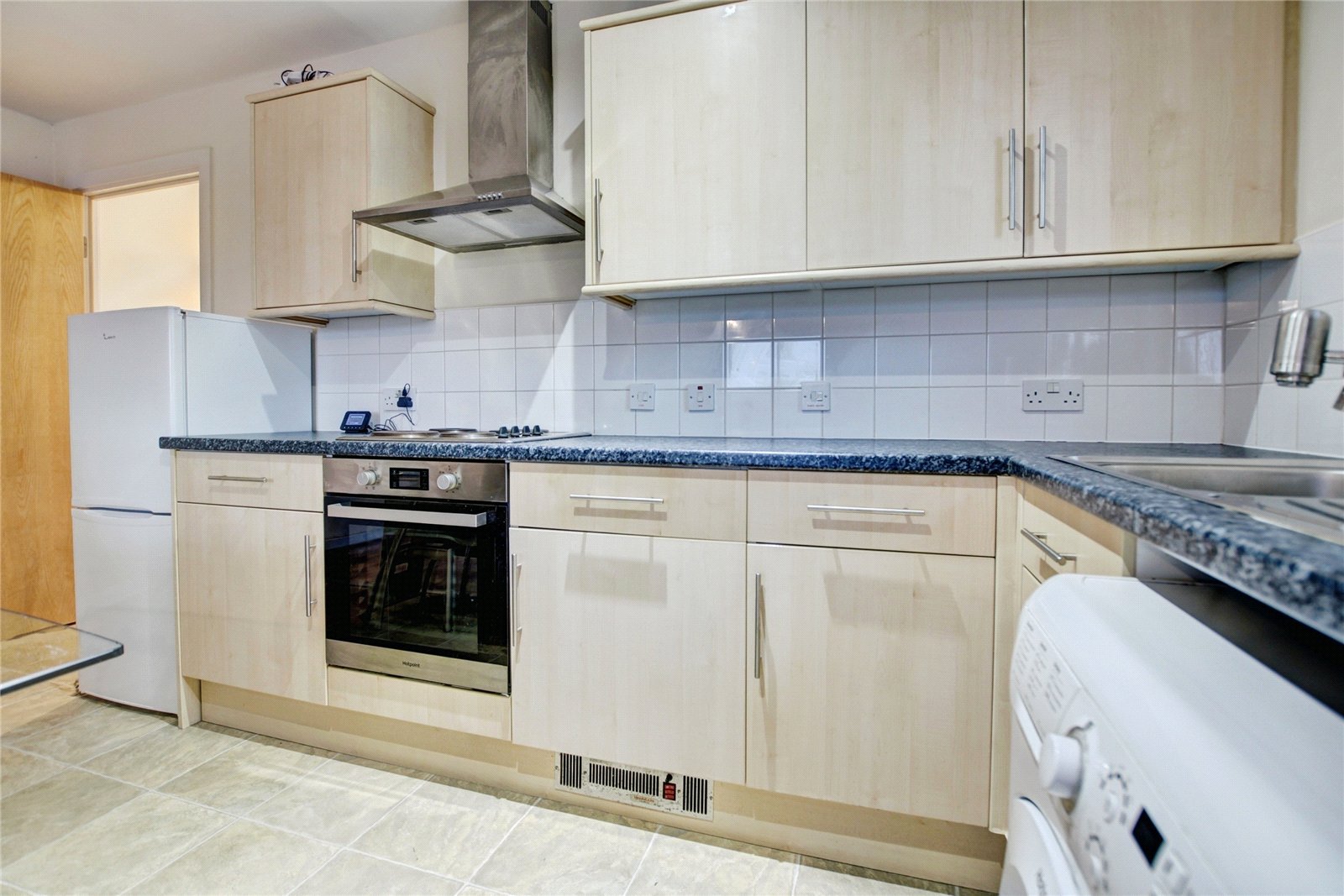 Range of wall and base units with work surfaces incorporating; stainless steel sink unit with mixer tap, electric oven and hob with extractor fan above, freestanding fridge freezer, washing machine part tiled walls, spotlights.