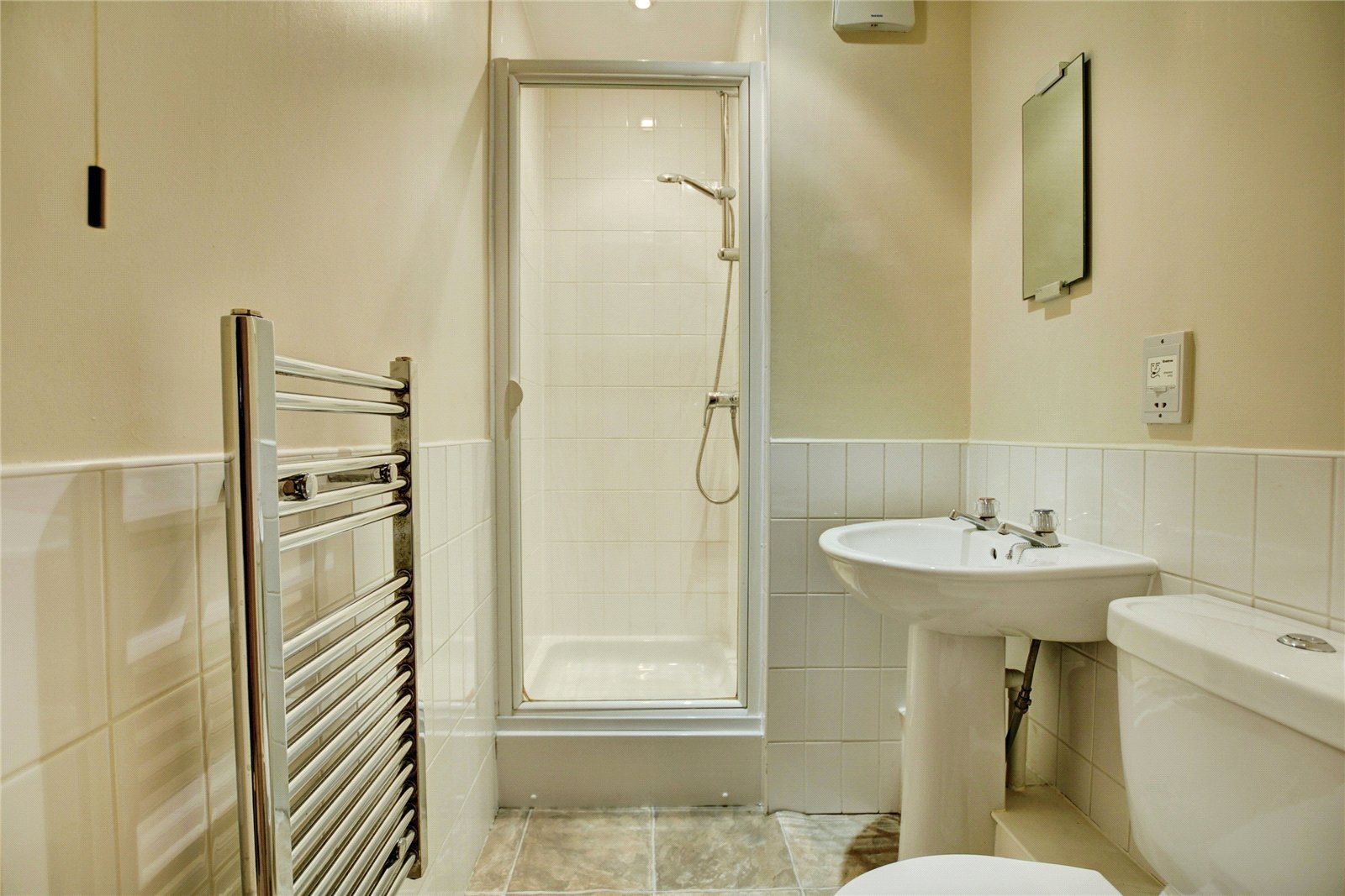 Shower cubicle with glass screen, WC, pedestal wash hand basin, part tiled walls, heated towel rail, extractor fan.