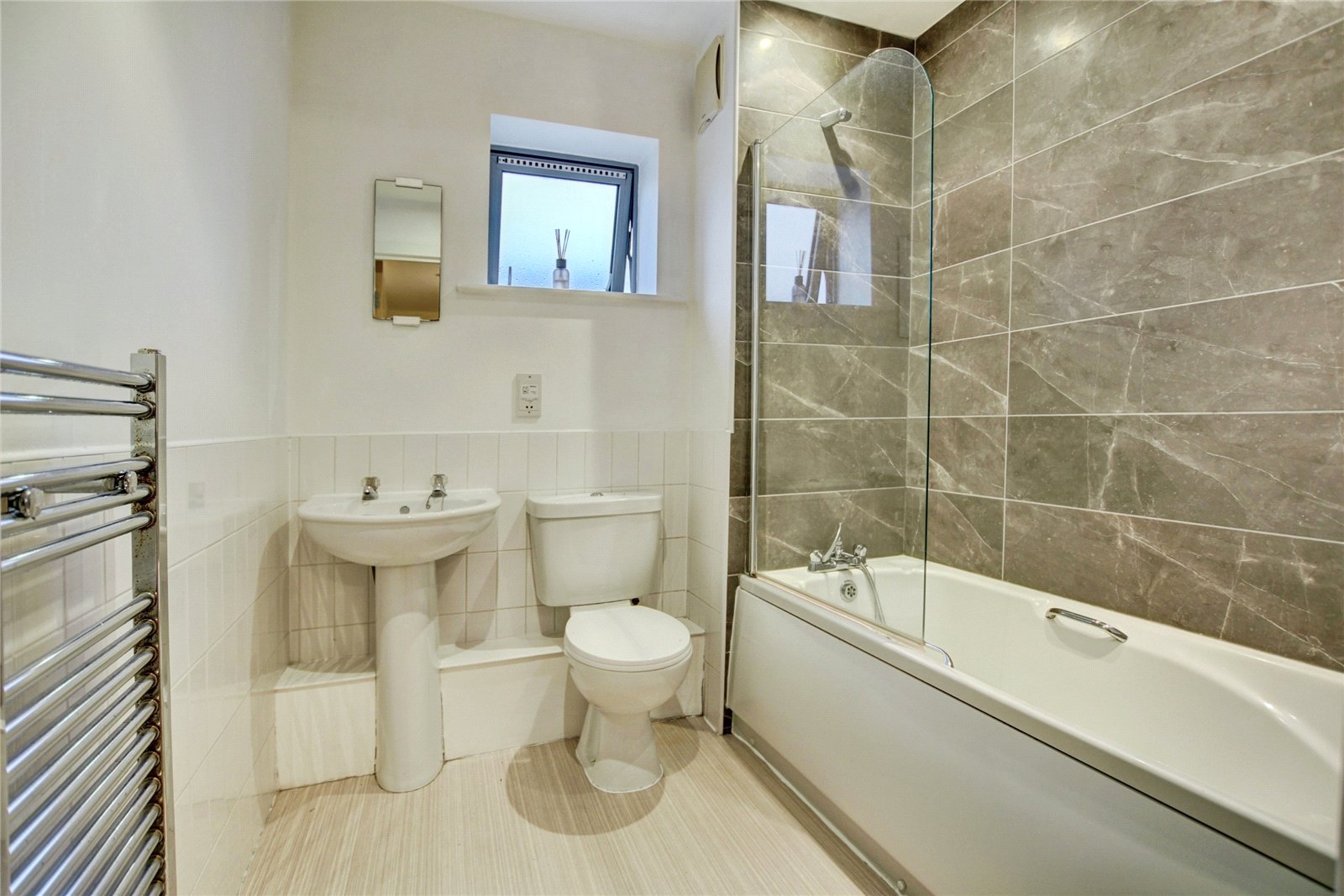 Panelled bath with shower overhead and glass shower screen, WC, pedestal wash hand basin, part tiled walls, electric shaving point, heated towel rail, extractor fan.