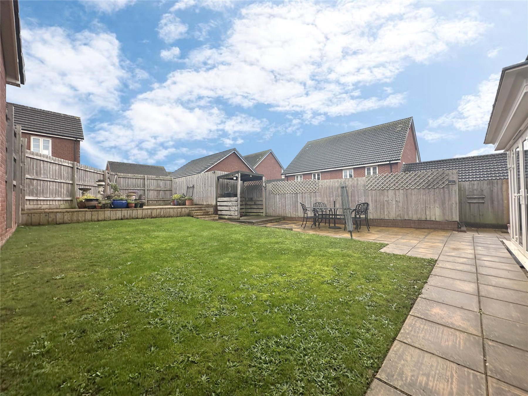 OUTSIDE Large rear garden laid to lawn and patio area. Rear access to driveway for two cars and garage.