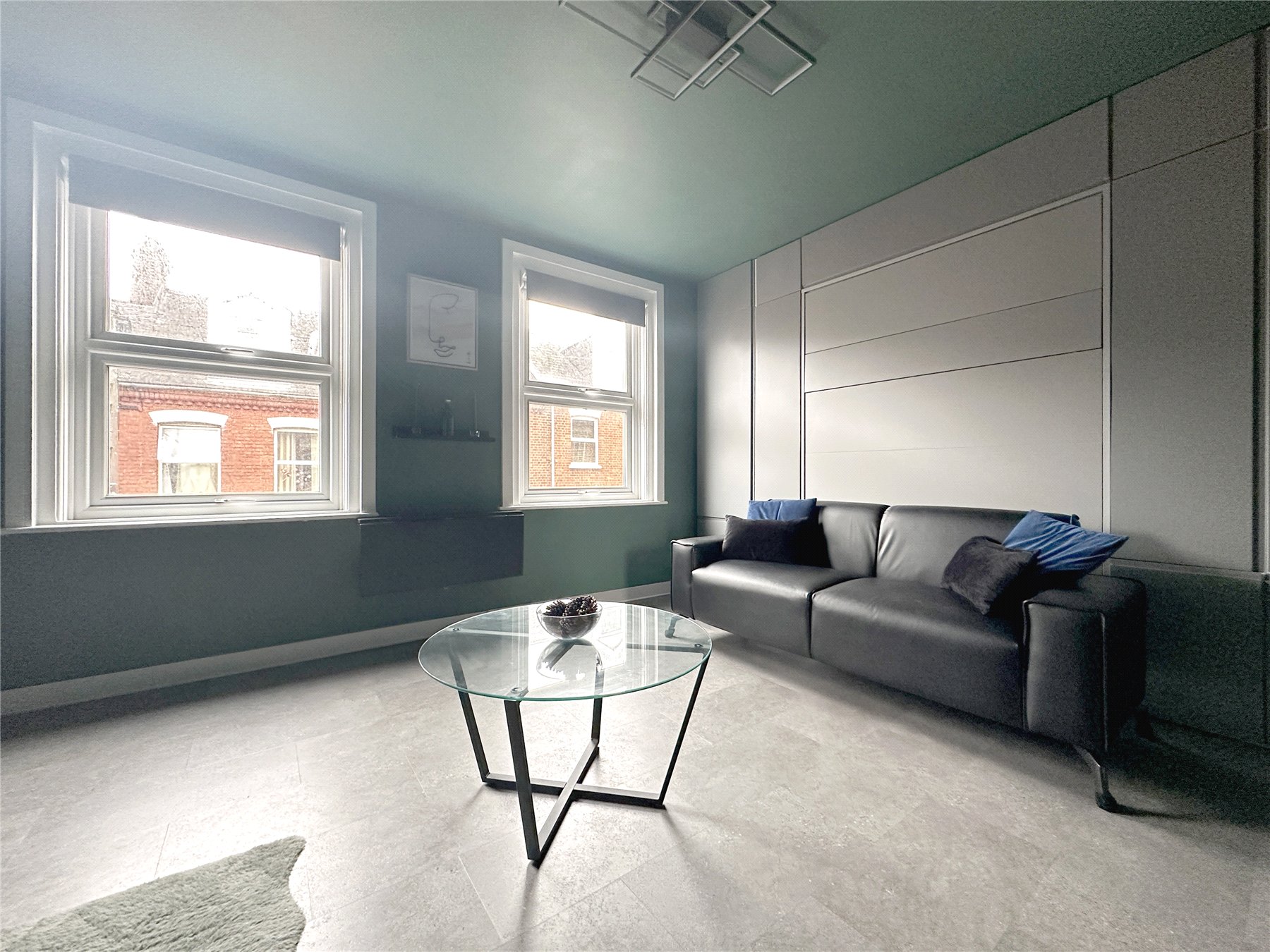 STUDIO/LOUNGE/BEDROOM 14' x 11'10" (4.27m x 3.6m). A modern and contemporary studio equipped with plenty of built in storage, fold away double bed, sofa, desk and chairs. Two double glazed windows to the front to the property with fitted roller blinds. Electric radiator and leading into-