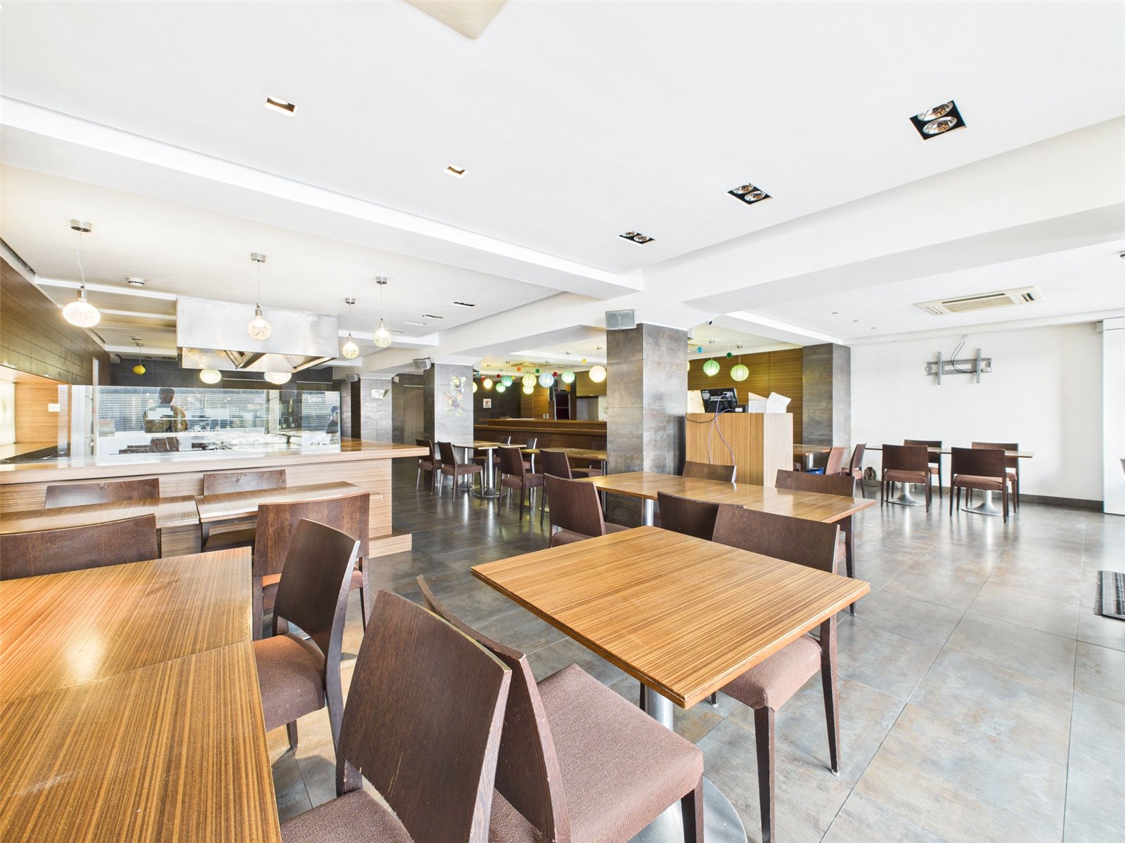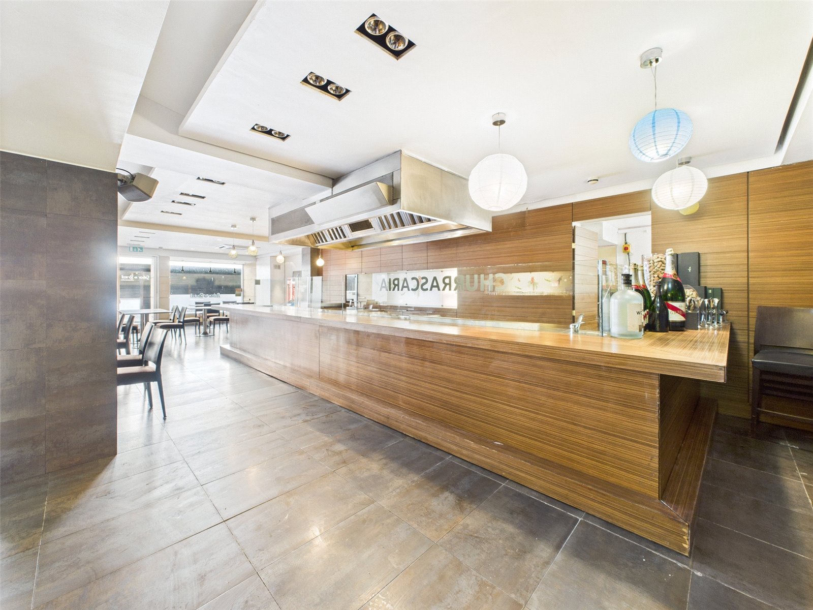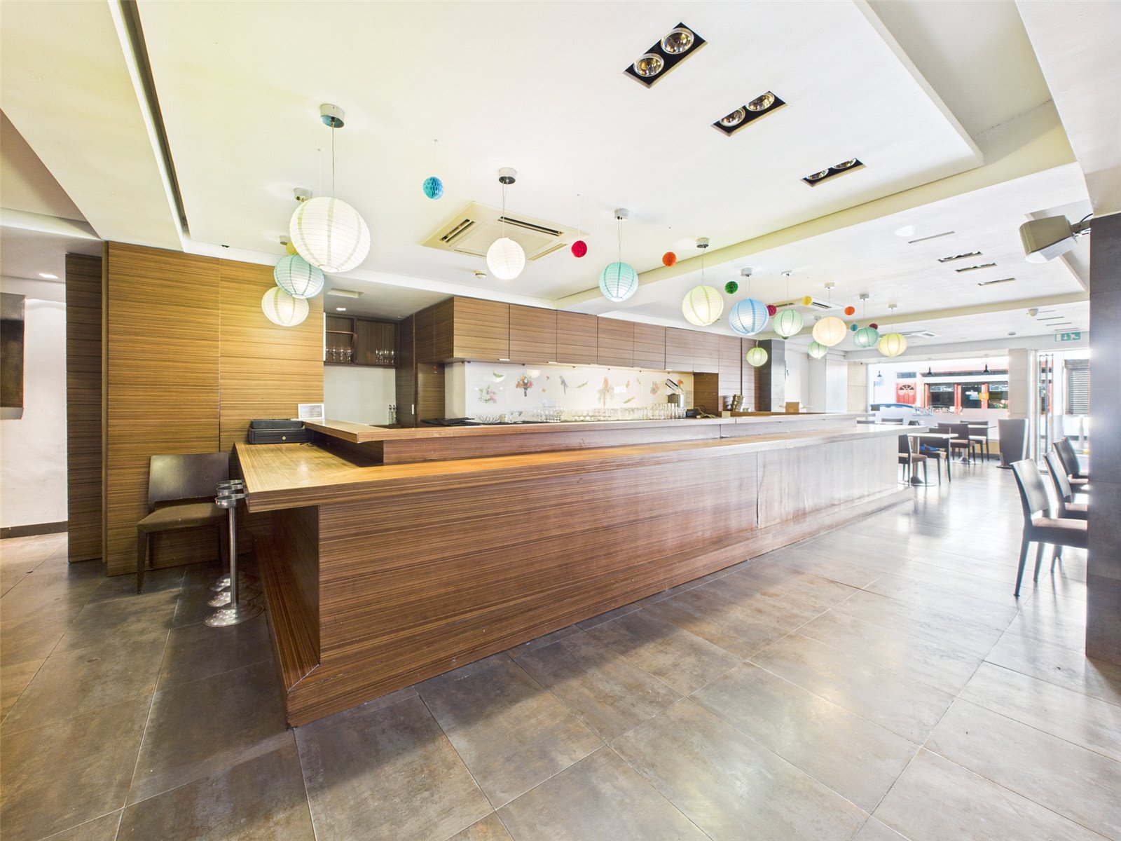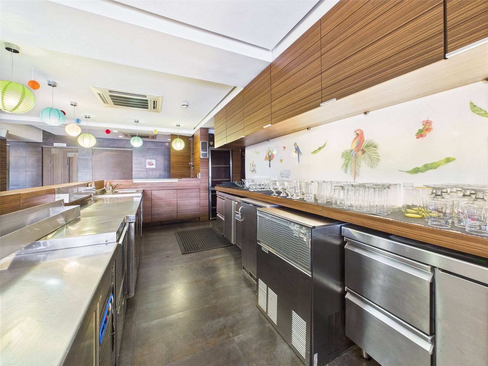 - Stylish open-plan restaurant floor with tiled flooring, a statement bar, fitted units, appliances, stainless-steel sink, extractor, air-conditioning, and feature lighting.