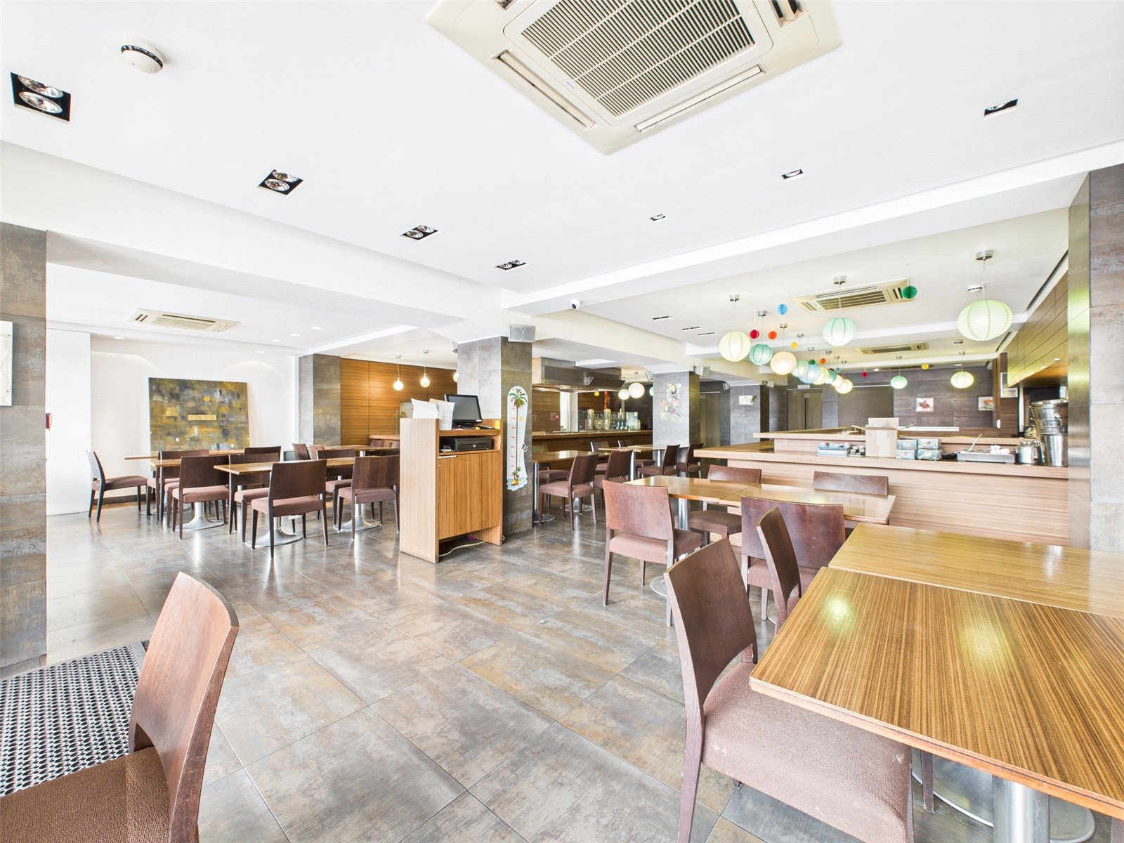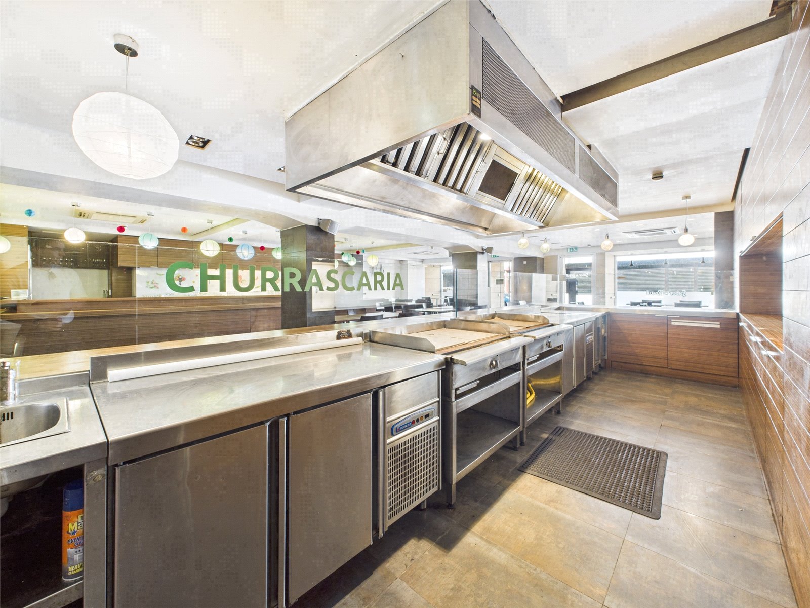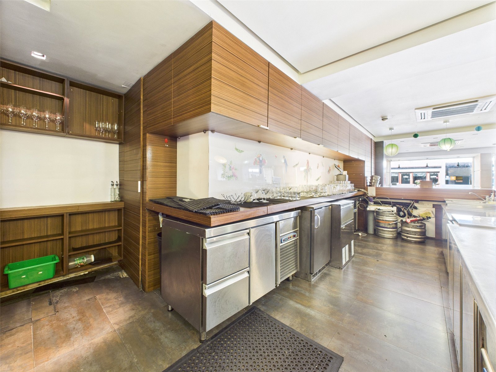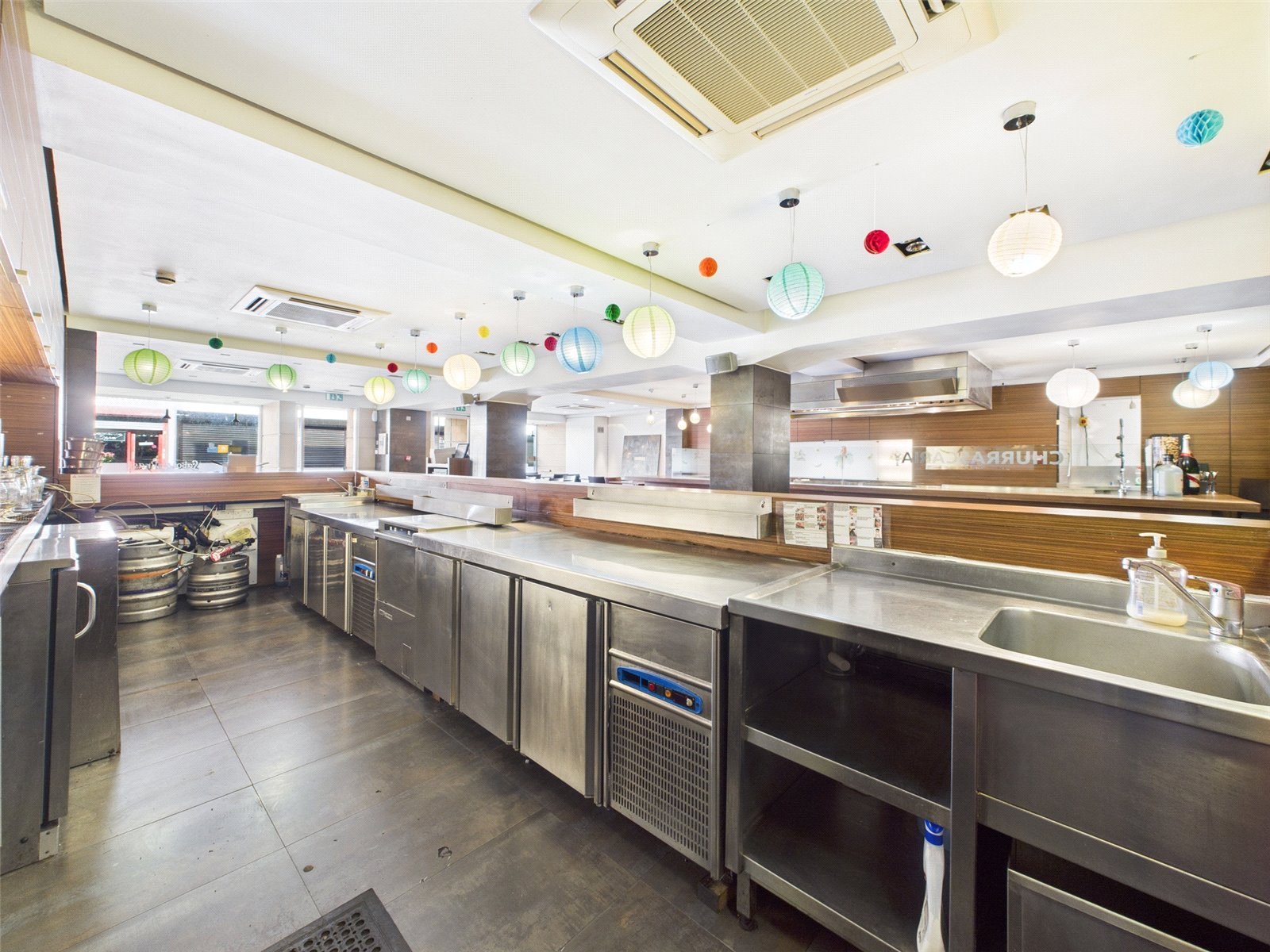 - Stylish open-plan restaurant floor with tiled flooring, a statement bar, fitted units, appliances, stainless-steel sink, extractor, air-conditioning, and feature lighting.
