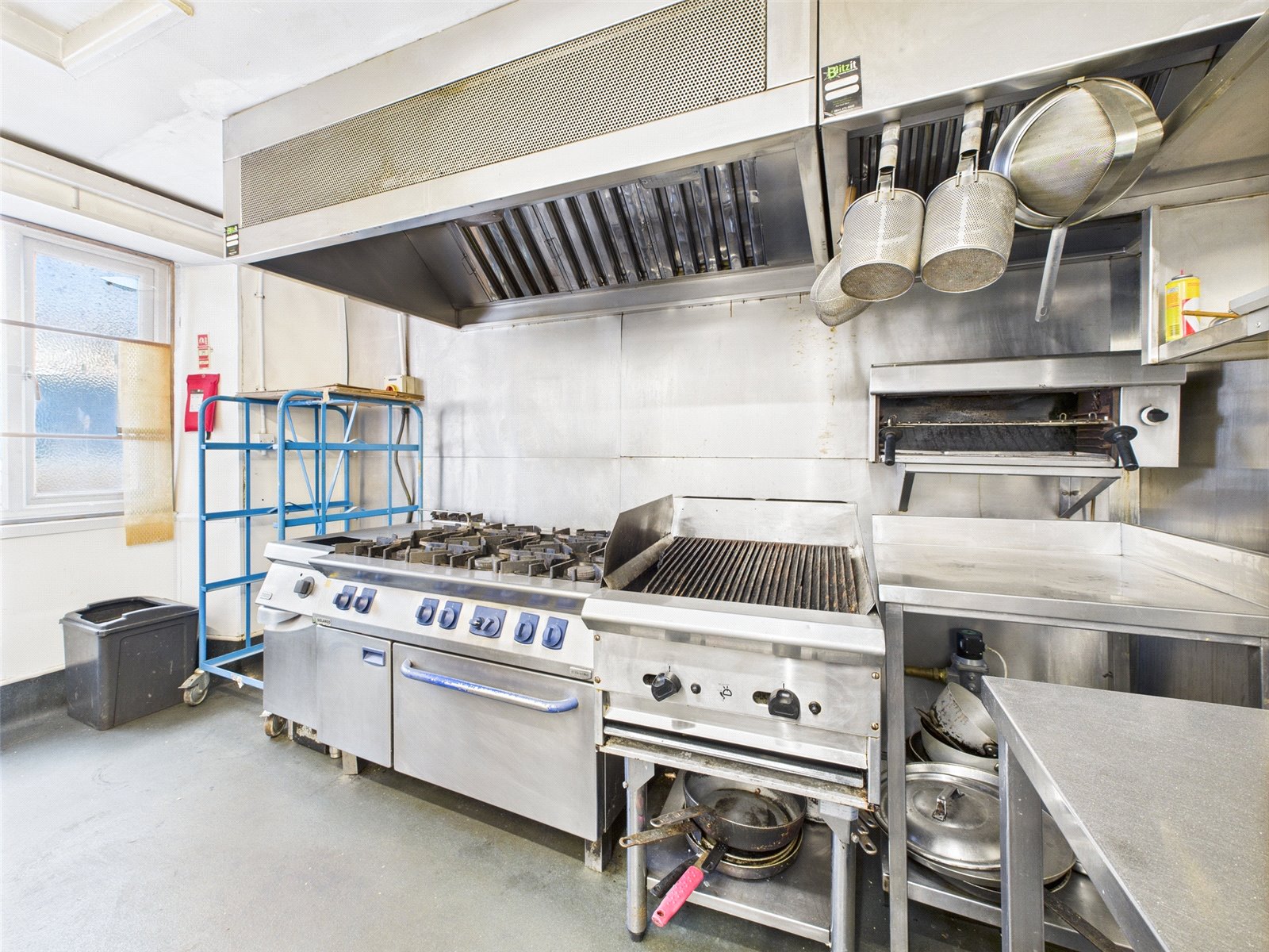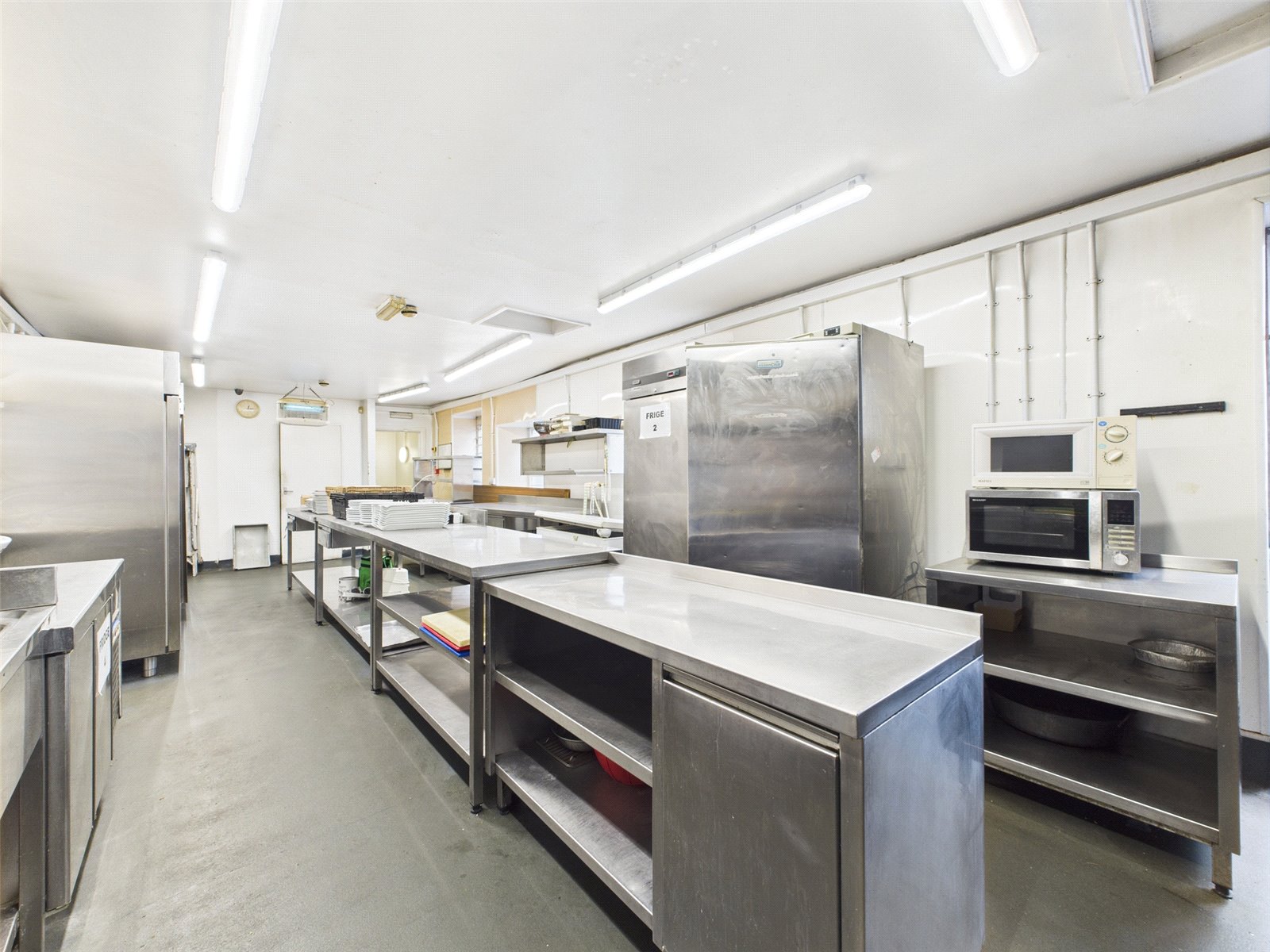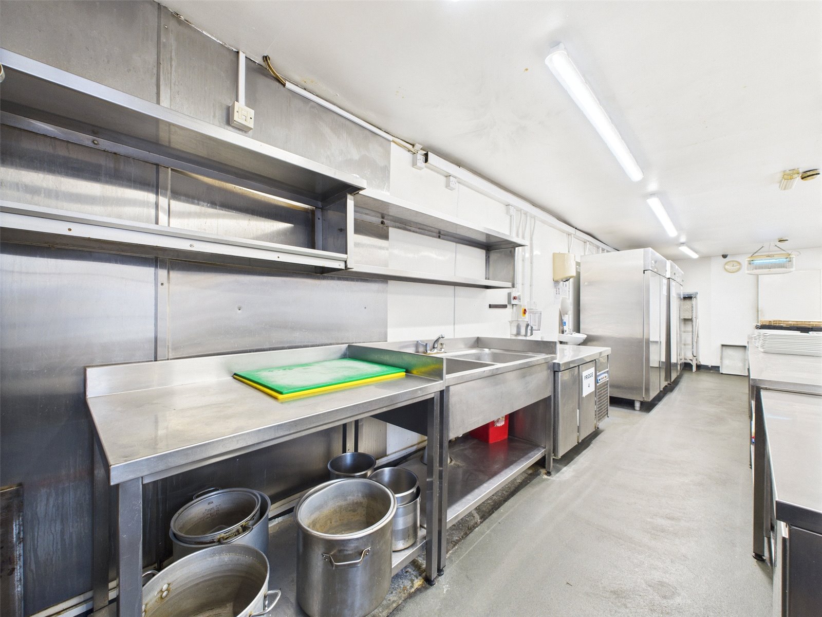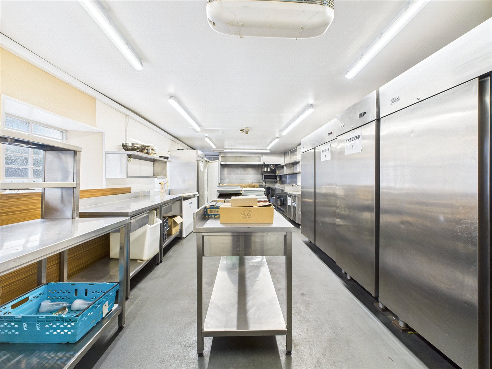 - Large kitchen space includes double sink, industrial fridges/freezers and gas boiler