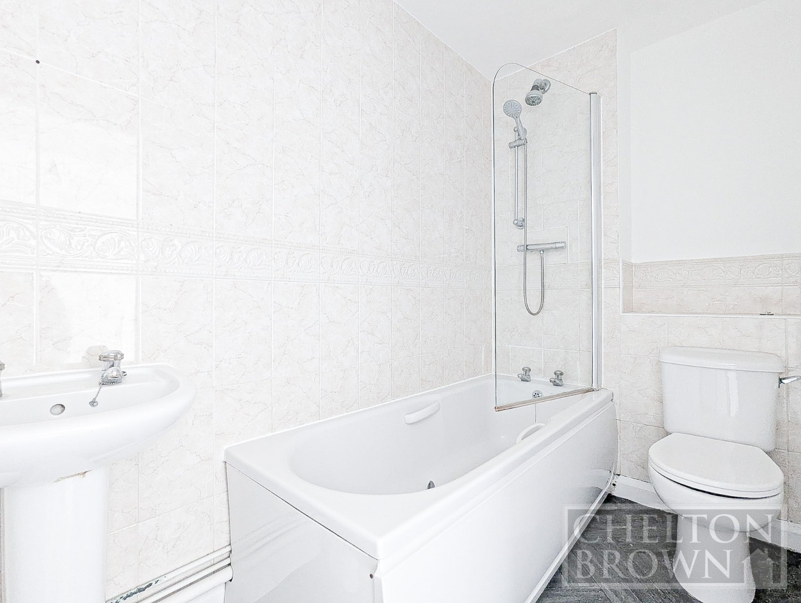 The family bathroom is fitted with a white suite and includes a shower over the bath, providing practicality for everyday living.