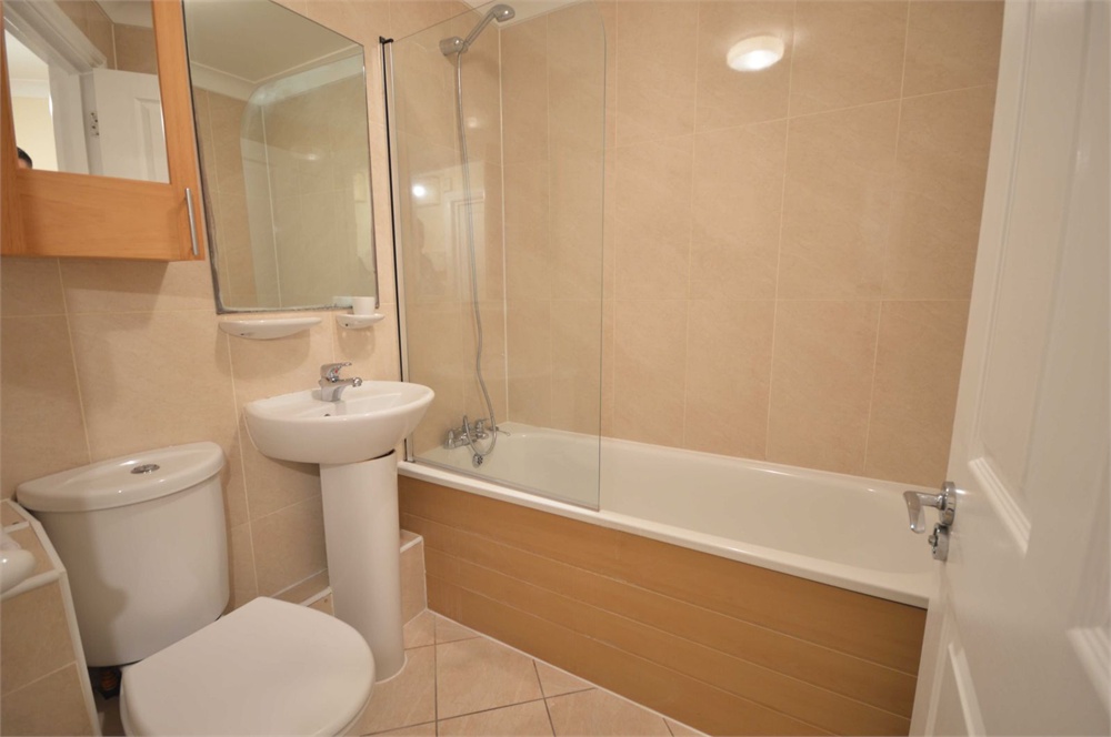 Bathroom 5'11" x 5'8" (1.8m x 1.73m). Plain ceiling. Extractor fan. Tiled flooring. Tiled walls. Bath with shower over. Low level W.C. Wash hand basin.