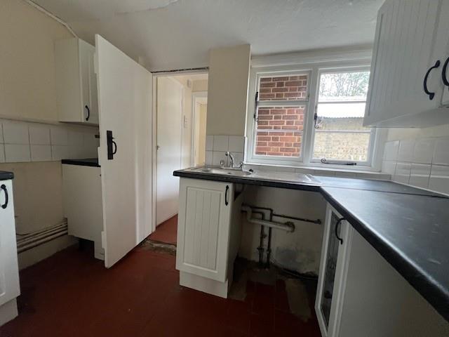 Kitchenette - 2.95 x 1.5 (9'8" x 4'11") - Window to rear, black / grey granite effect work top surfaces, fitted wall cupboards and base units, quarry tiled floor, space for fridge, plumbing for a washing machine, space for an electric cooker.