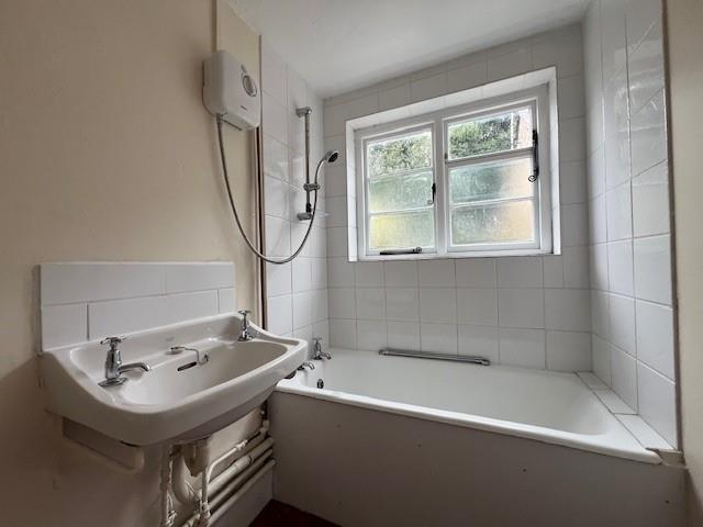 Bathroom - Bath , hand wash basin, low level WC, quarry tiled floor, part tiled walls, fitted electric shower, radiator.