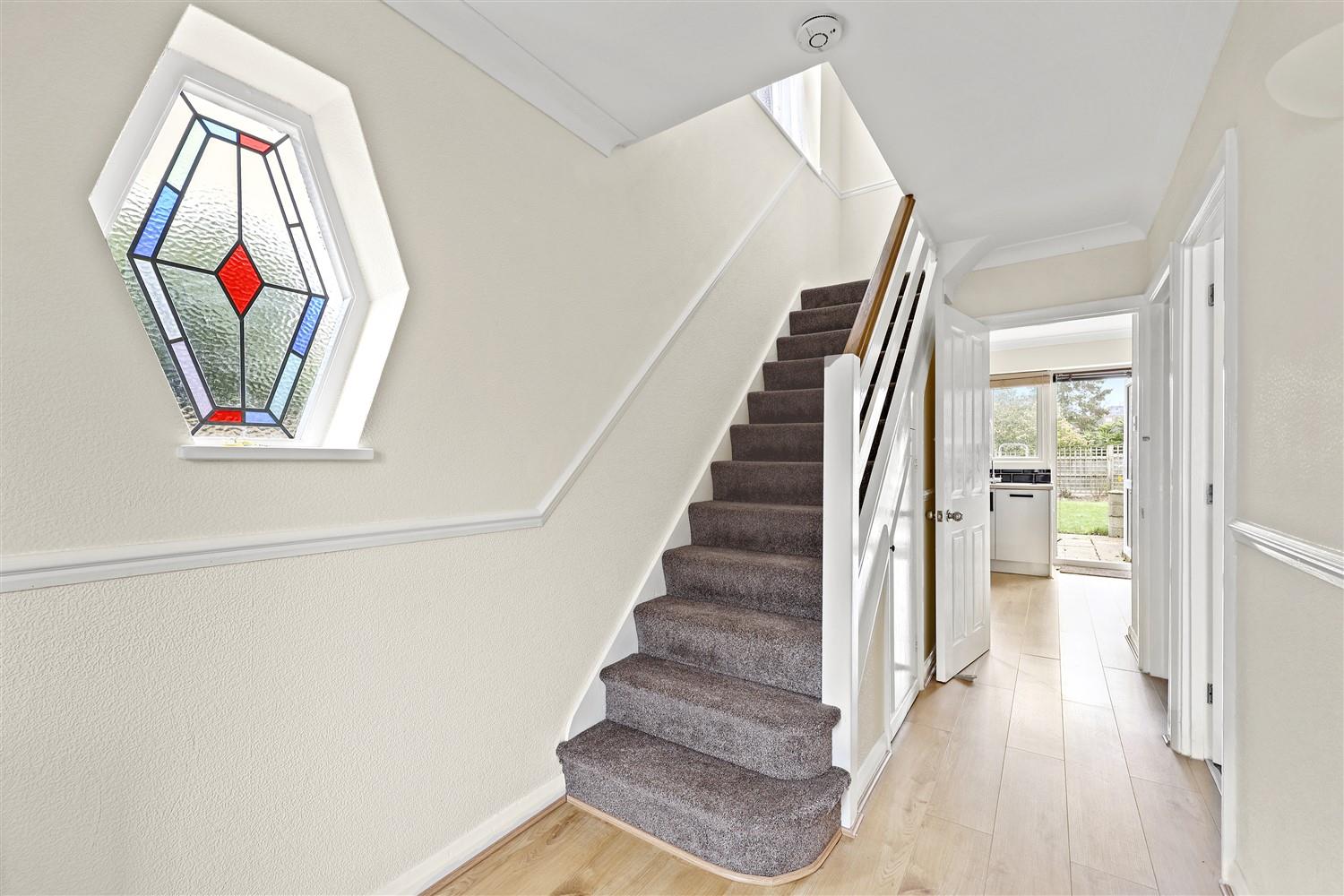 The ground floor opens with a bright and welcoming entrance hallway, setting the tone for the rest of the property. This leads into a modern, stylish kitchen featuring ample storage and workspace, ideal for both everyday cooking and entertaining. To the right, the spacious living and dining area offers a comfortable and versatile space, filled with natural light and perfect for family living. The room flows seamlessly into a charming conservatory, creating an additional reception space that enjoys views over the neatly maintained rear garden and provides direct access to the outdoors.