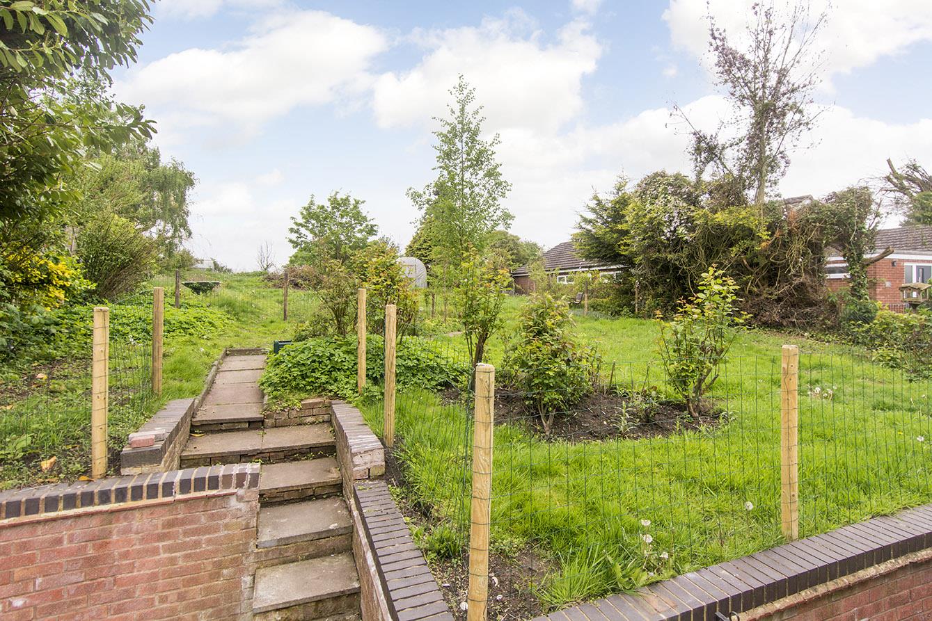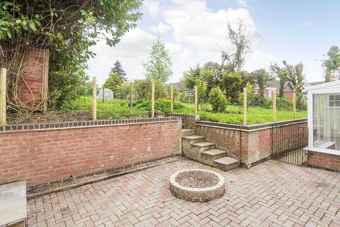 Outside - Directly to the rear of the house is a block paved patio area with pedestrian gated access to the front. There are steps up to a lawned area with brick retaining wall and post and wire fencing. There is open land to the rear.